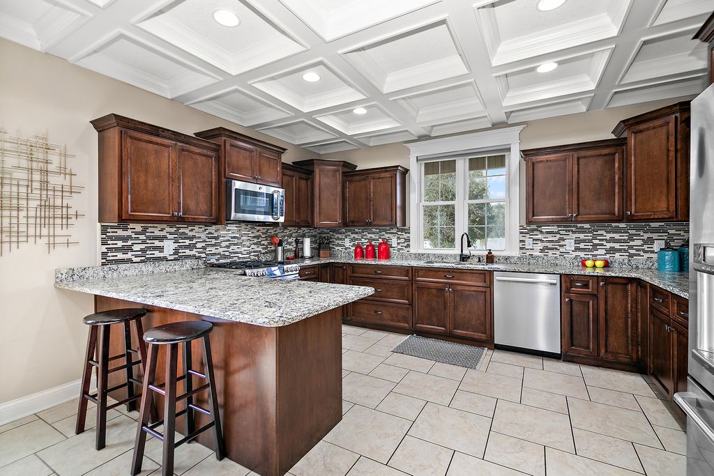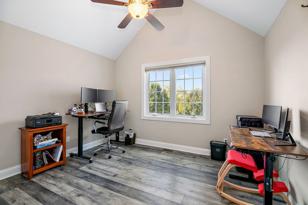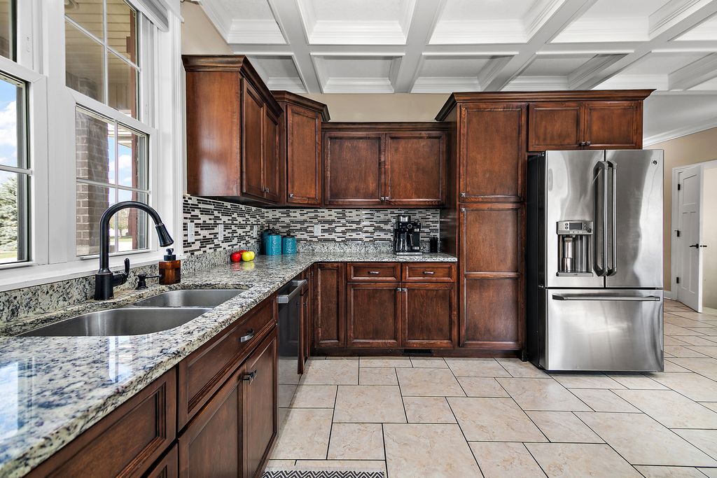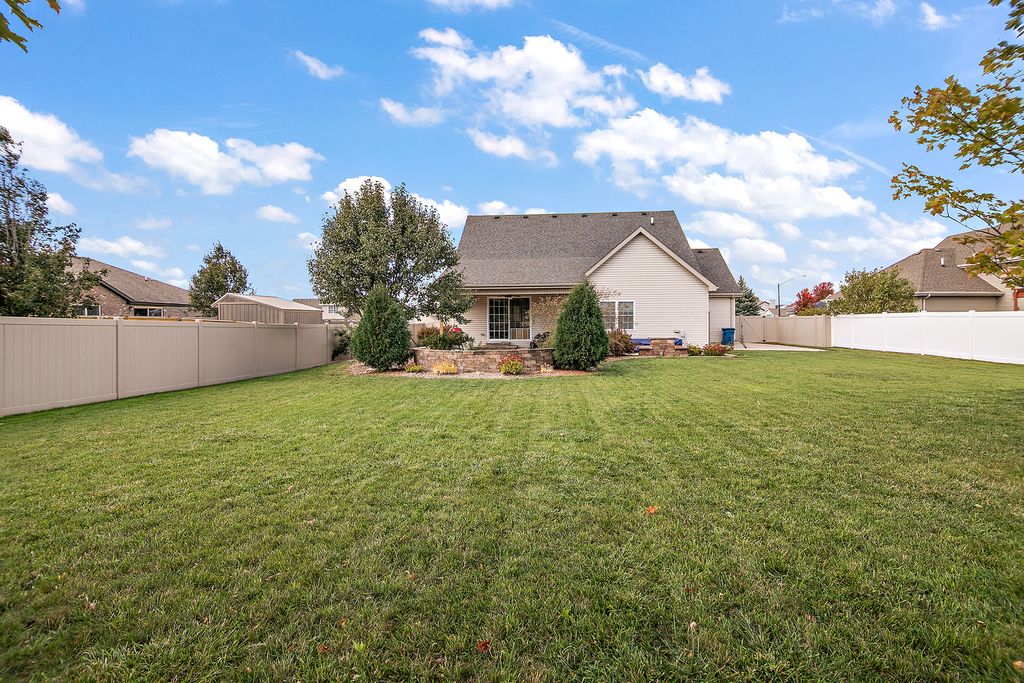 This stunning Craftsman style home lives large with its spacious rooms, soaring ceilings, and custom finishes throughout. Every inch reflects meticulous attention to detail from the coffered kitchen ceiling, full basement, oversized 3 car garage, to the high efficiency furnace and AC, expansive brick paver patio to heated basement and garage floors! Throughout the home, you'll find granite countertops, premium GE Cafe stainless steel appliances, and custom cabinetry galore, offering both function and beauty. The first floor primary suite is an absolute retreat, featuring a luxury bathroom with a walk-in shower equipped with four body sprays and three additional shower heads. Step outside and fall in love with the entertainer's dream backyard, complete with a covered, lighted brick paver patio, built-in paver seating around the firepit, paver waterfall feature and a fenced yard featuring a shed with covered patio, and space for a future hot tub. Additional highlights include a walk-in attic for extra storage, and a laundry area with negotiable washer and dryer. Exceptional craftsmanship, energy efficiency, and thoughtful design make this home truly one-of-a-kind. You'll feel the difference the moment you walk in.