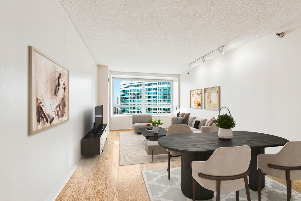Live in the heart of Streeterville in this spacious 920 sq. ft. one-bedroom condo with hardwood floors throughout and a large open living/dining room-perfect for hosting or relaxing. Oversized picture windows bring in great natural light and feature stone ledges ideal for extra seating, display space, or indoor plants. The open kitchen offers great flow with a breakfast bar, white cabinetry, and stainless-steel appliances. The large primary bedroom is a true retreat with soffit lighting, a big picture window, and a walk-in closet. The bath includes a soaking tub/shower combo, extended vanity, and extra medicine cabinet storage. Enjoy everyday convenience with full-size in-unit laundry, abundant storage, and an included storage cage. Some of the neighborhoods lowest HOA Fees. This well-managed full-amenity building offers 24-hour door staff, fitness center, conference room, hospitality suite, and a sundeck with grilling stations. Prime location-steps to Northwestern Hospital & University Campus, Lurie Children's, the lakefront, Ohio Street Beach, Whole Foods, Target, Walgreens, dining, and Michigan Avenue shopping. Comfort, convenience, and city living at its best! Rental Parking options available.