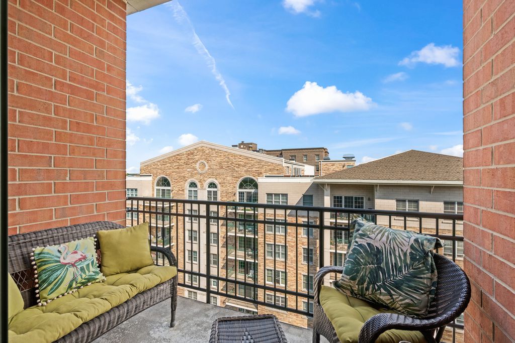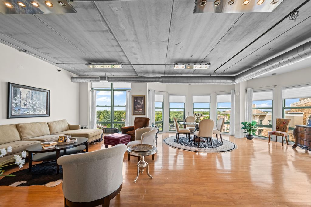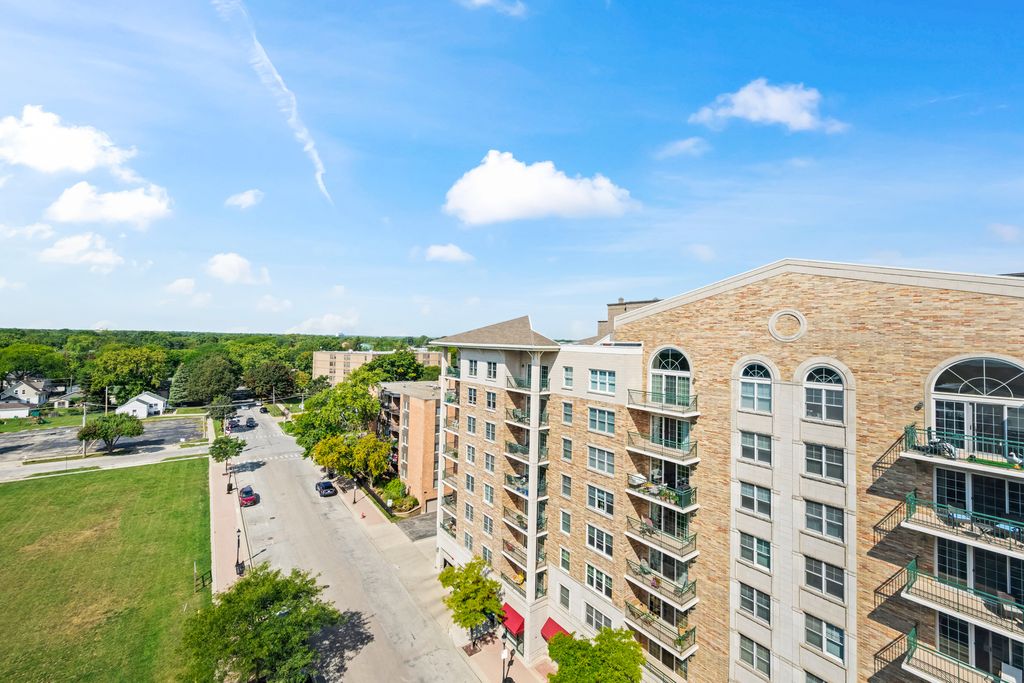 Largest unit in the building- 2 BR Model (this unit has expanded living space in place of 2nd BR)...Exquisite one-of-a-kind Luxury Penthouse residence in a premier Loft Building with unmatched Downtown Arlington Heights Views. Rarely available Turret Style curvilinear end unit is the perfect blend of spectacular architectural features with modern urban living at its finest. Discover elevated lifestyle living in this exceptionally updated luxury residence located in one of Arlington Heights' most sought-after boutique loft buildings. Set high above the vibrant downtown scene, this sophisticated residence offers breathtaking panoramic views through dramatic floor-to-ceiling windows, filling the space with natural light and framing the skyline like a work of art. This spacious home offers expanded flexible living space. Step into a thoughtfully designed interior that blends modern elegance with industrial-chic character, featuring soaring 10' ceilings, gleaming hardwood flooring, designer lighting, updated tile baths, and premium finishes throughout. The open-concept layout flows effortlessly from the spacious Living and Dining Room with cozy fireplace to the gourmet chef's Kitchen-with custom cherry cabinetry, granite countertops, mini stacked stone backsplash, and stainless steel appliances-ideal for entertaining or relaxing in refined comfort. The private balcony offers a serene outdoor escape with sweeping city views, perfect for morning coffee or evening cocktails. The expansive Primary Suite is a true retreat, complete with ample closet and updated Bath. This exclusive residence is part of a secure, elevator building with luxury amenities, including attached garage parking, private storage, and a welcoming, stylish lobby. All of this just steps from award-winning restaurants, Summer Alfresco dining, charming cafes, boutique shopping, Metropolis Performing Arts Centre, the Arlington Heights Memorial Library, and short 3-min walk to Metra train station-placing Chicago just a short ride away while you enjoy the charm and community of one of the Northwest Suburbs' most dynamic downtowns. Whether you're downsizing, relocating, or seeking a lock-and-leave lifestyle with no compromise on style or location, this penthouse offers a rare opportunity to own a one-of-a-kind residence in a truly premier setting. Covered Parking available for $40/month with direct access parking garage (incl. in current HOA fee listed). This home is a must see! Not Just a House... Your Next Home!