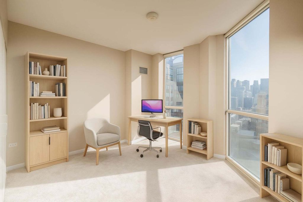 Incredible opportunity to own a sophisticated corner residence in one of River North's most desirable tiers at 645 N Kingsbury. Floor-to-ceiling windows flood the home with natural light and showcase dramatic skyline views. The open layout features hardwood floors throughout, a chef's kitchen with stainless steel appliances and granite countertops, and a private balcony off the living room, perfect for relaxing or entertaining. The luxurious primary suite offers spa-inspired comfort with double vanities and a serene bath. Full-amenity building includes 24-hour door staff, fitness center, party room, and bike room. Perfectly situated across from Montgomery Ward Park with easy access to the East Bank Club, Chicago's Riverwalk, and many shopping and dining options. Commuters take ease with highway access only 3 blocks away. Deeded parking available for $30,000.