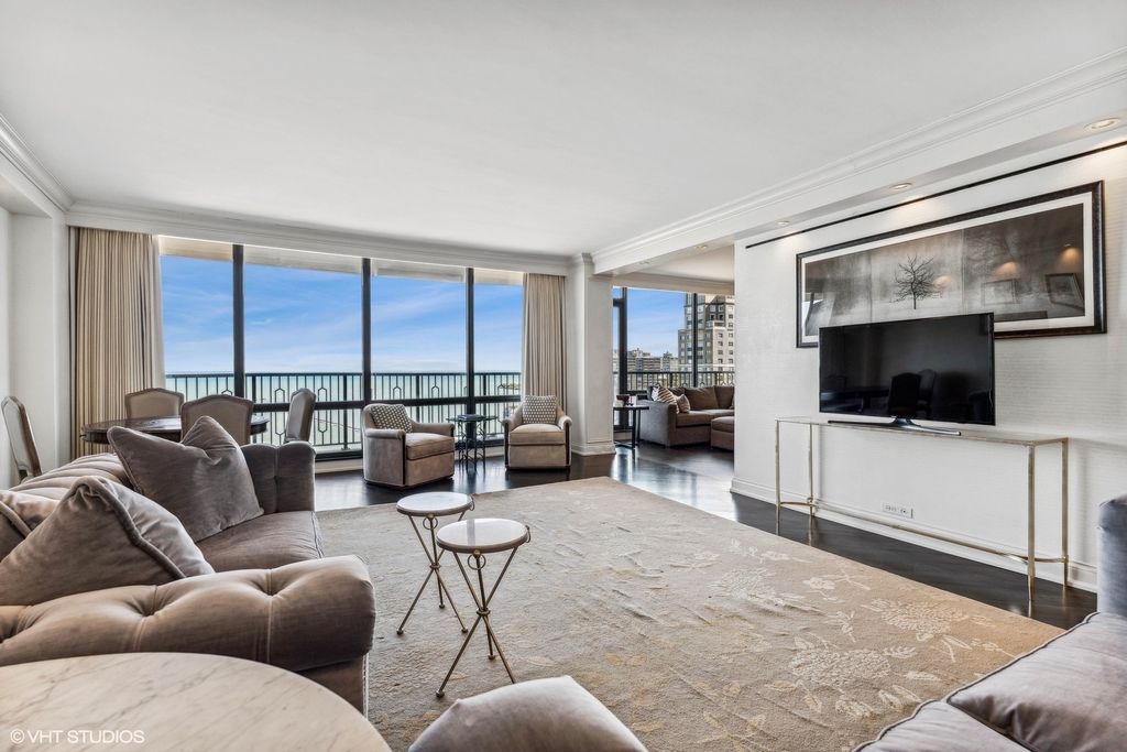 Rarely available 2,200 square foot 1 bed/2.1 bath beautifully updated home at the Gold Coast's renowned Carlyle. A gracious foyer welcomes you into the open floor plan layout awash in panoramic views of Lake Michigan stretching from Lincoln Park to iconic East Lake Shore Drive, and beyond! An expansive living room opens to the flexible dining/family room, leading to the newly renovated kitchen featuring Sub Zero refrigeration, Wolf cooktop, Wolf convection oven, wine cooler, all accented with iceberg quartzite countertops and marble backsplash; attached butler's pantry includes built-in shelving and walk-in pantry. Massive primary suite featuring custom dressing room, two full baths, walk-in closet plus custom wall of closets. Designer lighting, wide-plank hardwood flooring, and motorized window treatments throughout the upgraded home, and unique to the "B" tier, both front and rear balconies to enjoy sunrise to sunset views. One valet parking space and storage included. Two units per floor in this expertly run building, enjoy privacy and security with experienced and attentive doormen. A+ amenities include indoor pool, fitness, sundeck, and fabulous ballroom with catering kitchen. Walk to world class dining, shopping, lakefront paths, farmer's market, Northwestern medical, and all that Chicago has to offer!