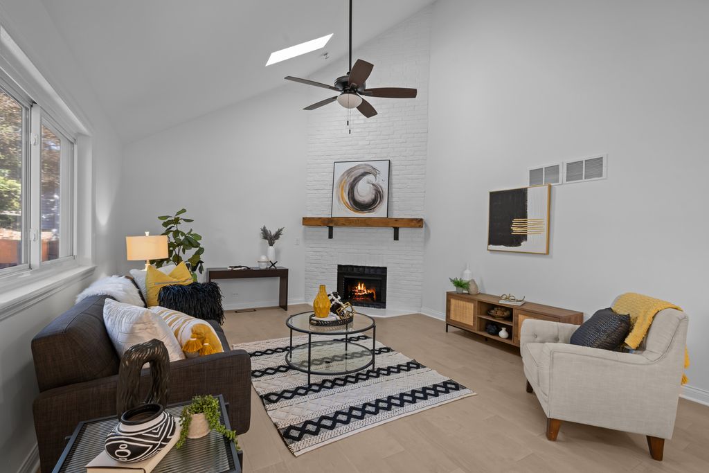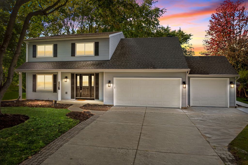 COMPLETELY RENOVATED with 4 CAR GARAGE! This stunning 4 bed, 2.1 bath home in Springbrook Crossing offers brand-new Mohawk engineered hardwood flooring, lighting, paint, and high-end finishes throughout. Step through the covered front porch into a refreshed interior where the formal living room flows into the dining room with a stylish light fixture and continuous new flooring. The chef's kitchen features stainless steel appliances, two-tone cabinetry with 42" uppers, quartz countertops, a waterfall island, custom backsplash, and updated lighting. Sliding doors from the eating area open to a newly refinished deck are perfect for indoor/outdoor entertaining. The family room impresses with a vaulted ceiling, skylight, and a refreshed floor-to-ceiling masonry fireplace. A new powder room and laundry room complete the main level. Upstairs, the primary suite offers a vaulted ceiling and walk-in closet. The fully renovated en suite bath boasts a cabinet vanity with gold-toned hardware and fixtures, a custom-tiled shower with gold-toned waterfall showerhead, tiled niche, and glass doors with marble transition piece. Three additional bedrooms with new flooring and paint share another beautifully updated full bath. The finished basement provides a spacious rec room, office/den, and ample storage. Brand new Mohawk Designer Collection carpeting in 2nd floor and basement. Outside, enjoy refreshed landscaping, a new concrete walkway from the garage to the backyard, and plenty of green space. The rare 4-car garage (2-car plus 2-car tandem) provides excellent storage or workshop space. Both garage doors and garage door openers are brand new and equipped with MyQ for wifi enabled garage door use. Move right in and enjoy modern luxury in this beautifully renovated home!