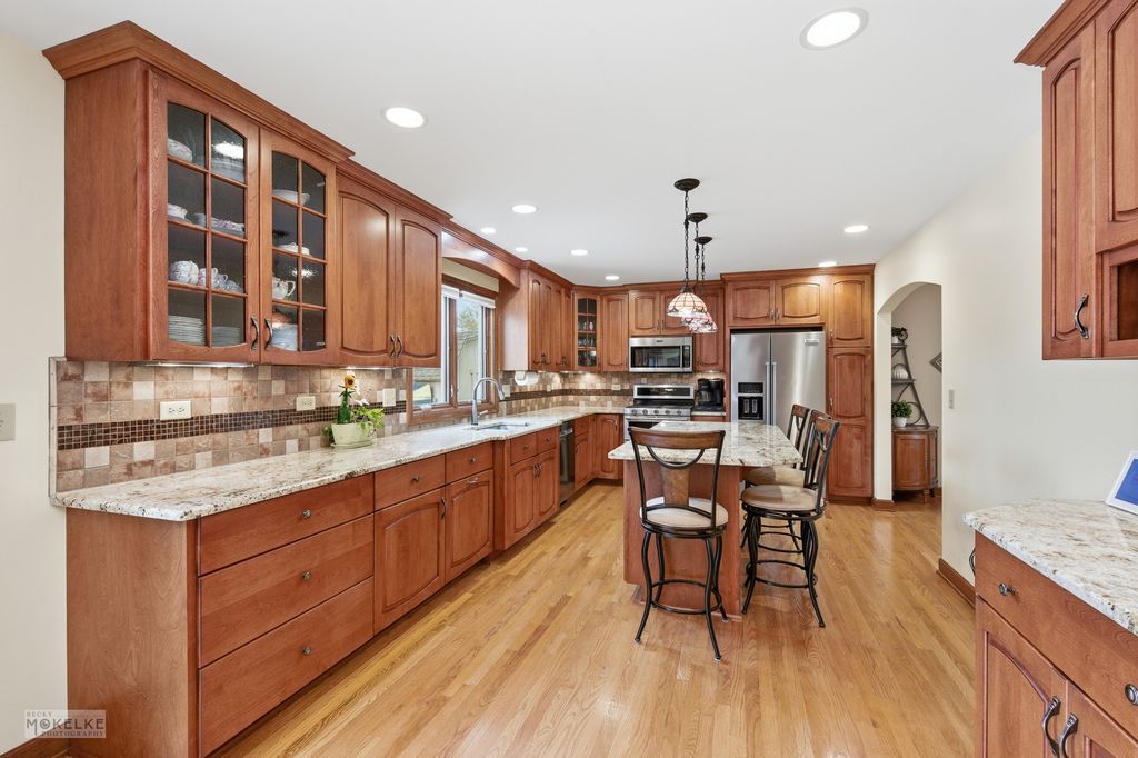 Vacation at your dream home, tucked away at the end of a peaceful cul-de-sac, set on an oversized, professionally landscaped lot, it offers a true backyard retreat complete with a fiberglass built-in pool & hot tub spa, with automatic safety cover and lush outdoor living spaces with fully fenced yard - the perfect blend of luxury and relaxation in coveted Naperville D203. With over $100k in recent home improvements, this beautifully updated and meticulously maintained home is just a short walk to Ranch View Elementary. The exceptional curb appeal is highlighted by a completely renewed differentiated premium exterior, contemporary color scheme, and an inviting covered front porch. Step inside to a stunning remodeled kitchen featuring gleaming hardwood floors, custom 42" cabinetry with soft-close drawers and doors, granite countertops, stainless steel appliances, wine fridge, double oven, a tile backsplash, and a spacious island with seating for four. The kitchen flows seamlessly into a sunny dining area and an expansive family room highlighted by vaulted ceilings, recessed lighting, a masonry fireplace, built-in bookshelves and wall mounted TV which is included. A thoughtful home addition expanded the family room with continued vaulted ceilings and added a versatile office or fifth bedroom with vaulted ceilings, dual closets and tons of windows for maximum daylight. The main level also includes a spacious formal living and dining room with gleaming hardwood flooring, blinds, captures morning sun - ideal for entertaining and gatherings. Upstairs, the king-sized primary suite features a walk-in closet and a beautifully remodeled en suite bath with a dual-sink vanity and custom tiled bath/shower. All secondary bedrooms offer generous closet space and share an updated full bath with double vanities and tile work. The finished basement includes recessed lighting, drop ceiling, built-in storage nooks which provides flexible space for a recreation room, gym, and/or play area. The show stopping backyard is an entertainer's paradise: a spacious concrete patio, built-in pool with slide, relaxing hot tub spa , automatic pool/hot tub safety cover, trendy storage shed, and mature landscaping with flowering perennials and plenty of green space for play, play set, or additional seating. Major Updates include Premium LP SmartSide Siding, Facia, Gutters & Soffits (2024), Furnace (2022), A/C (2020), Roof (2018), Water Heater (2019), Radon Mitigation System (2019), Windows (2014), Sump Pumps (2022), Concrete Driveway (2015), Family Room/Office Addition (2000), Extra Attic Insulation (2019), New garage door and epoxy flooring (2024). With walkability to Ranch View Elementary and nearby parks, plus quick access to downtown Naperville, Metra, and major expressways, this home offers the perfect combination of comfort, convenience, and charm.