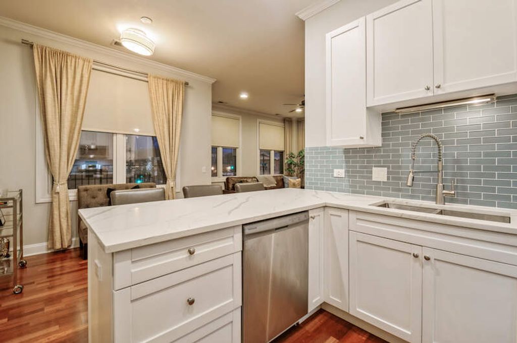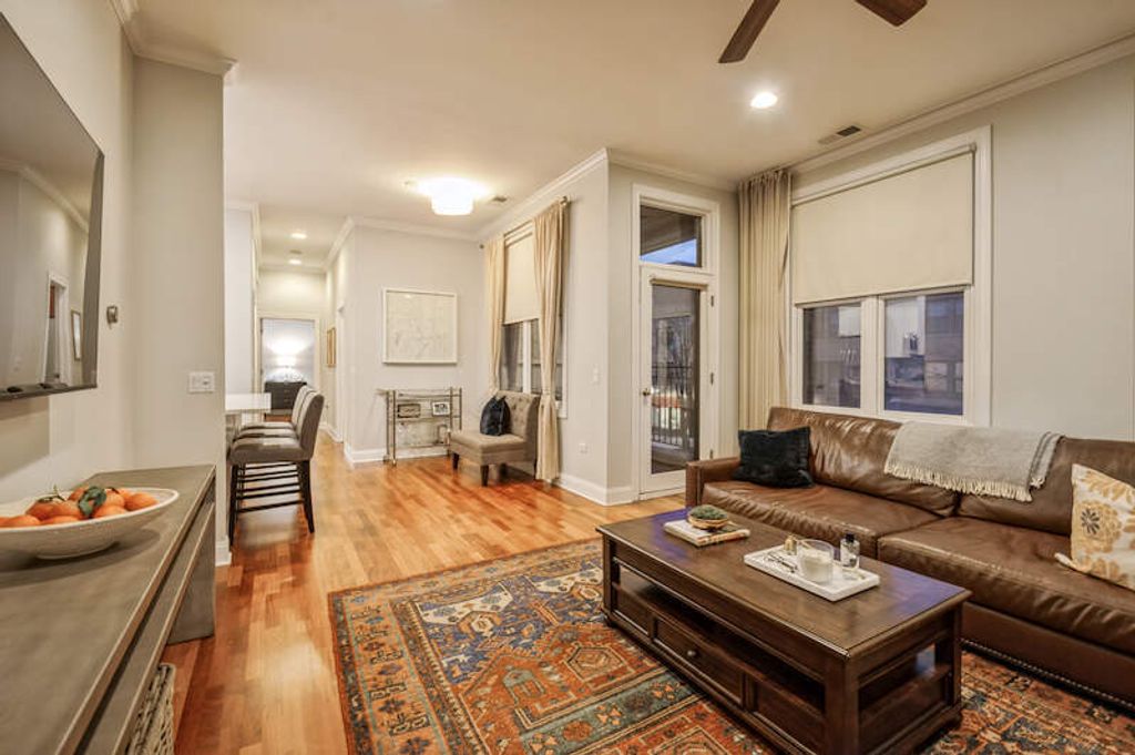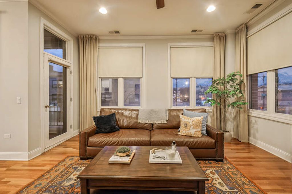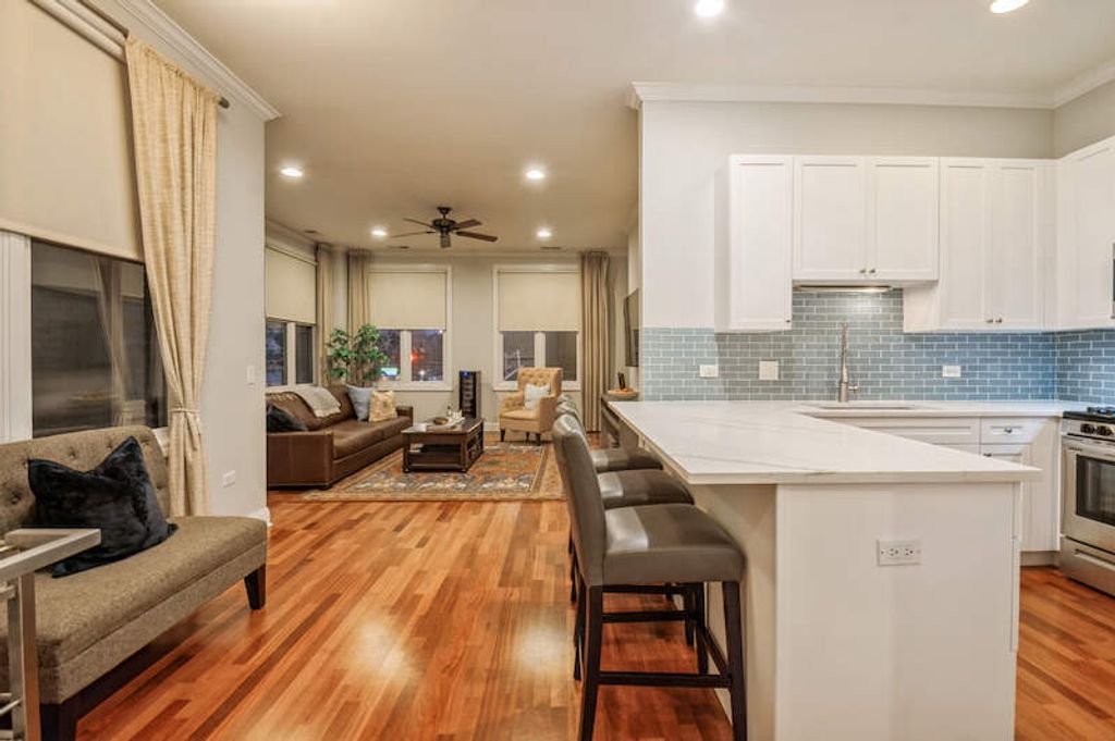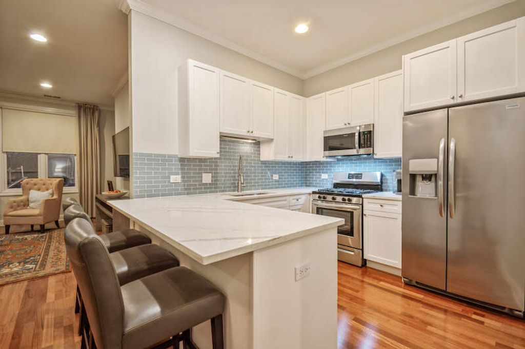 Spacious 2-bedroom, 2-bath condo in an elevator building in Ravenswood. This bright sunny unit has a large open-concept living and dining area, soaring 10' ceilings, and an in-unit washer/dryer. The newly updated kitchen; features custom cabinetry, quartz countertops and stainless-steel appliances. The primary suite offers custom closet space and a luxurious new bath with dual sinks, a separate shower, and a soaking tub. Enjoy southeast views from your private balcony. Heated garage parking included. Just blocks from the Damen Brown Line, Mariano's, and Lincoln Square's vibrant shopping and dining scene.