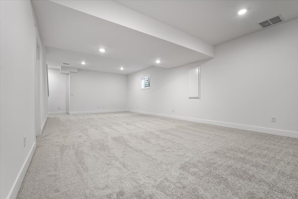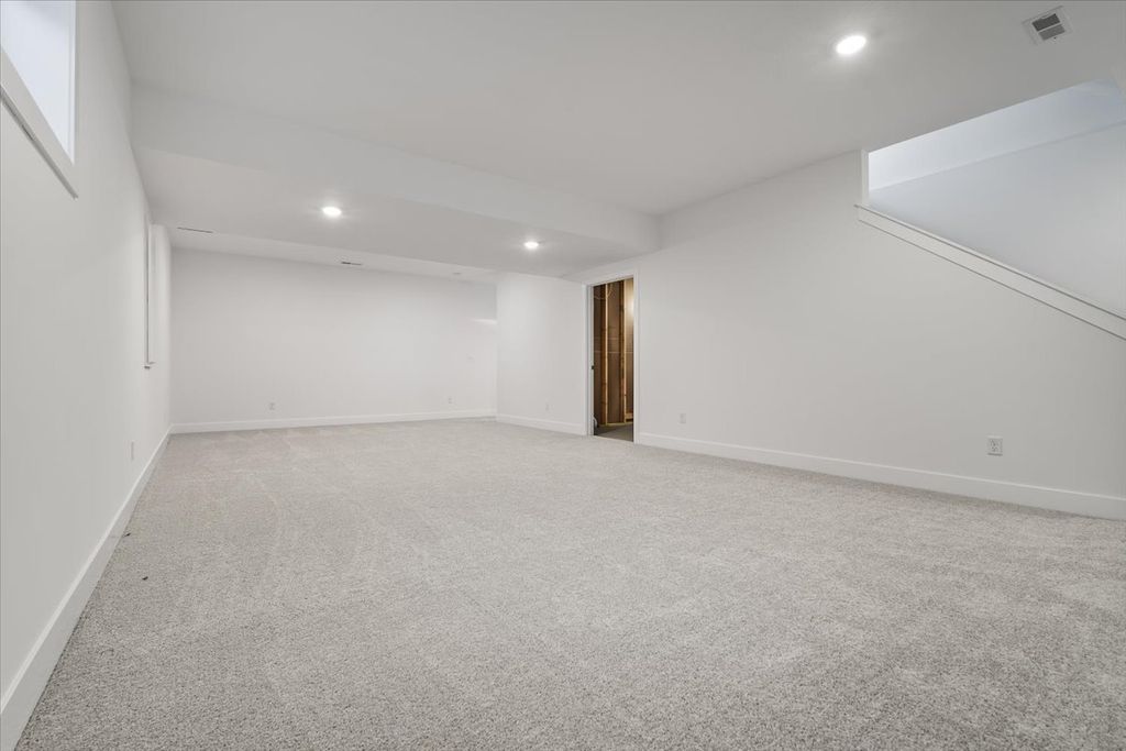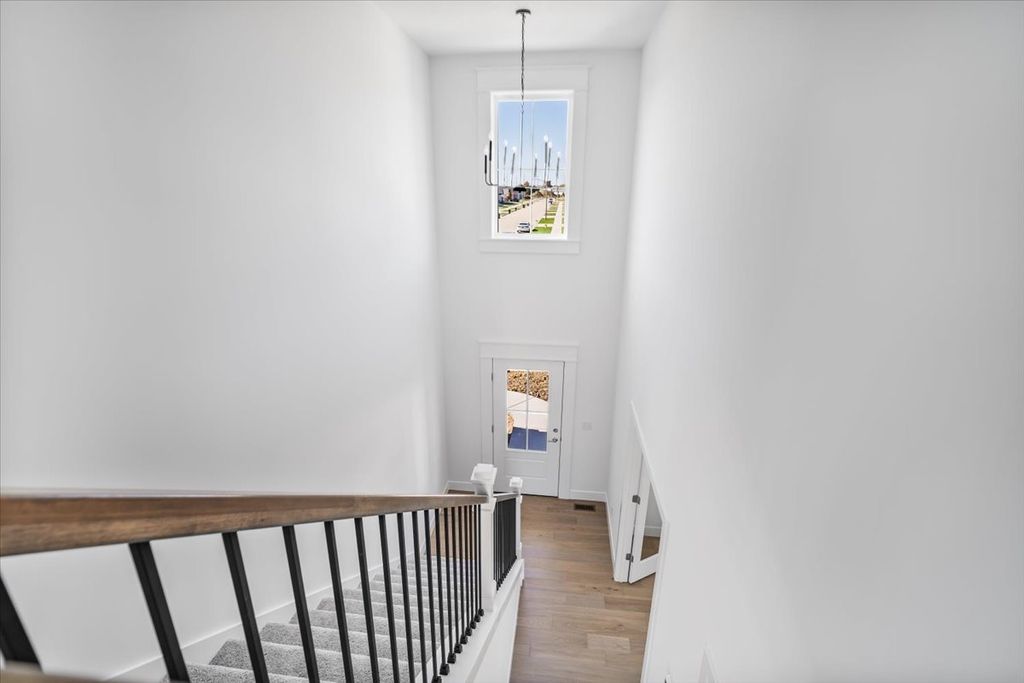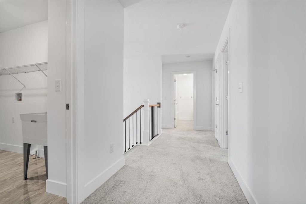 Welcome to 24 Stonehouse, situated in the latest phase of Harvest Pointe Subdivision on a premium lot, boasting a stunning 2-story residence with 5 bedrooms and 3 1/2 bathrooms, adorned with high-quality finishes and millwork throughout. Upon entering, the formal dining room and/or office are showcased. Beautiful wide plank engineered wood flooring is present throughout the main level. The kitchen is distinguished by white shaker cabinets with quartz countertops, black lighting, and chrome hardware, accompanied by a large center island with barstool seating, a tiled backsplash, walk-in pantry, and an open layout to the casual dining area and living room. A back hall drop zone leads to a 3-car garage, featuring a custom-built locker system. The upper level comprises a spacious laundry room, 3 bedrooms, and a generous primary suite. The primary suite boasts a dual sink vanity, shower, spa tub, and walk-in closet. The finished basement encompasses a recreational room, bedroom, full bathroom, and ample storage space. The property features full sod and standard landscaping package. Agent interest