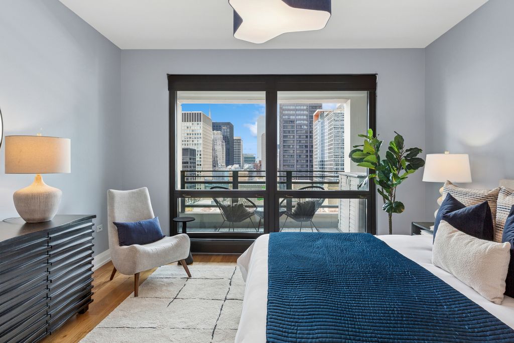 Live at the center of Chicago's Cultural Mile in this fully renovated 2BD/2BA residence (opened to oversized elegant 1 BR) on the 26th floor of The Heritage at Millennium Park. With an open layout, and a private covered balcony, this home blends modern design with effortless, low-maintenance living-perfect for anyone who wants world-class art, theater, dining, and the lakefront right outside the front door. Inside, over $100K in upgrades showcase thoughtful quality: wide-plank white oak floors, a chef's kitchen with Ultracraft high-gloss cabinetry, Ann Sacks tile, quartz counters, and new stainless steel appliances. Both baths are chic and calm with sleek fixtures, walk-in showers, and sophisticated tilework. Custom Elfa closets, designer lighting, Bali UV-filtering shades, and a new LG washer/dryer maximize comfort and storage. (Note: kitchen cabinetry reads closer to the soft tone shown in the entry photo-not bright blue.) The Heritage is a full-amenity, service-forward building with an indoor pool, fitness center, two outdoor terraces, and 24-hour door staff. Direct Pedway access connects you to shops, services, and every CTA line (to airports!) -no matter the weather. Step outside to Millennium Park, the Art Institute, acclaimed theaters, and the lakefront path.