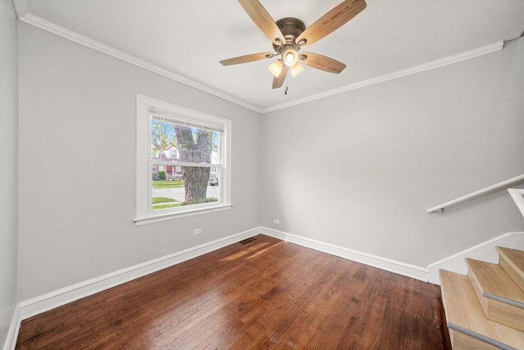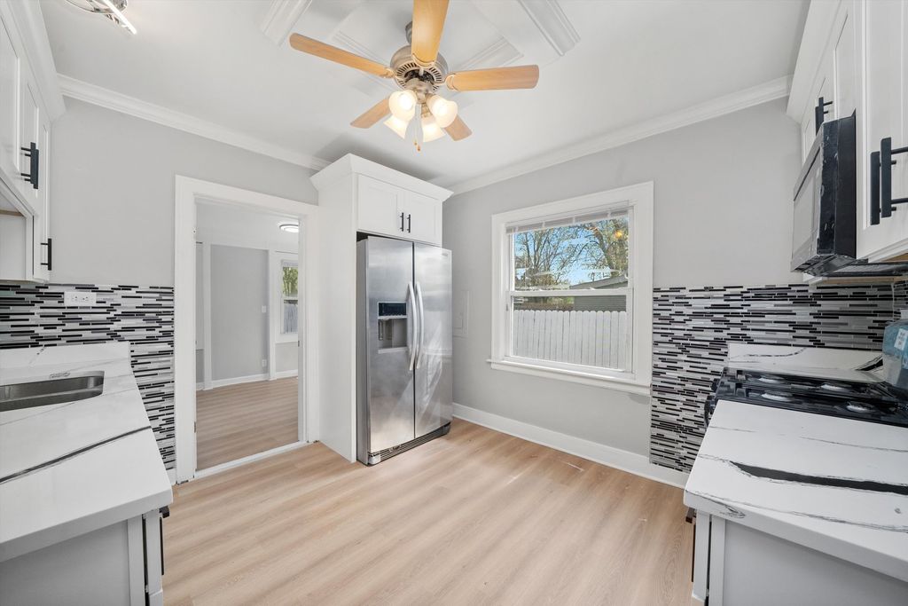 Polished and Professional describe this beautifully renovated 2 bedroom 1 bath home, with spacious family room and stunning kitchen. The 1 bedroom on the 1st floor has hardwood floors and the 2nd bedroom (entire 2nd floor space), has wood laminate flooring. All bedrooms are spacious, with ceiling fan and blinds. The bathroom has been beautifully updated. You will love the modern finishes in the living room with tray ceiling, fresh paint, hardwood floors, sleek light fixtures and abundant natural light. The updated kitchen boasts sleek granite countertops, tiled back splash, new cabinetry and stainless steel appliances (refrigerator, oven and microwave oven). In addition, enjoy the family room for additional comfort and space. In addition, there is a cozy laundry area, fenced yard and detached 1 car garage. New: light fixtures, hot water tank, lighting/ceiling fans, electric and plumbing, siding and gutters, new garage overhead door, new windows, hot water tank, remodeled bath, new doors, trim, wood laminate & refinished hardwood floors, crown molding and more. Central air can be installed for an additional five thousand dollars before closing.