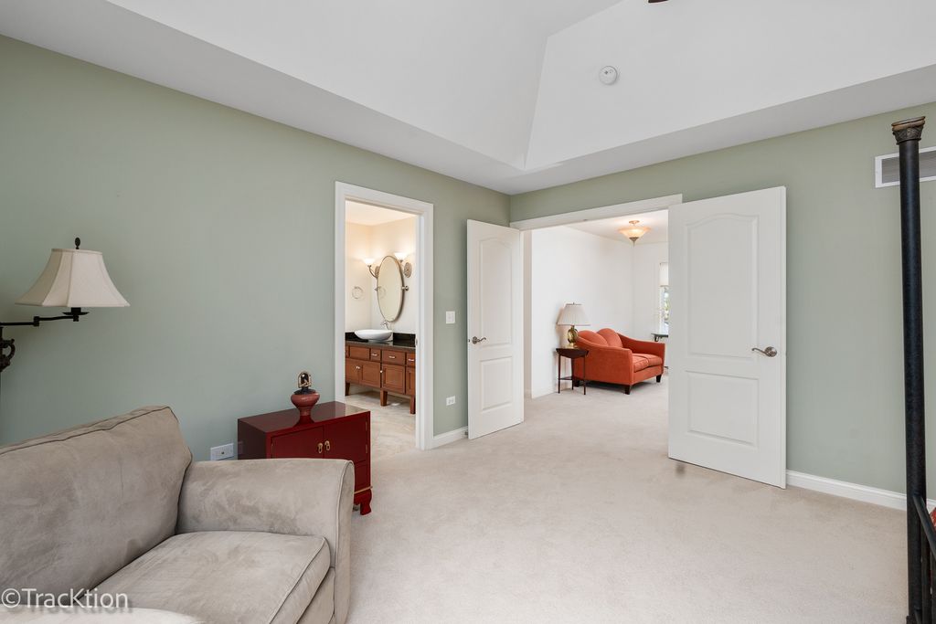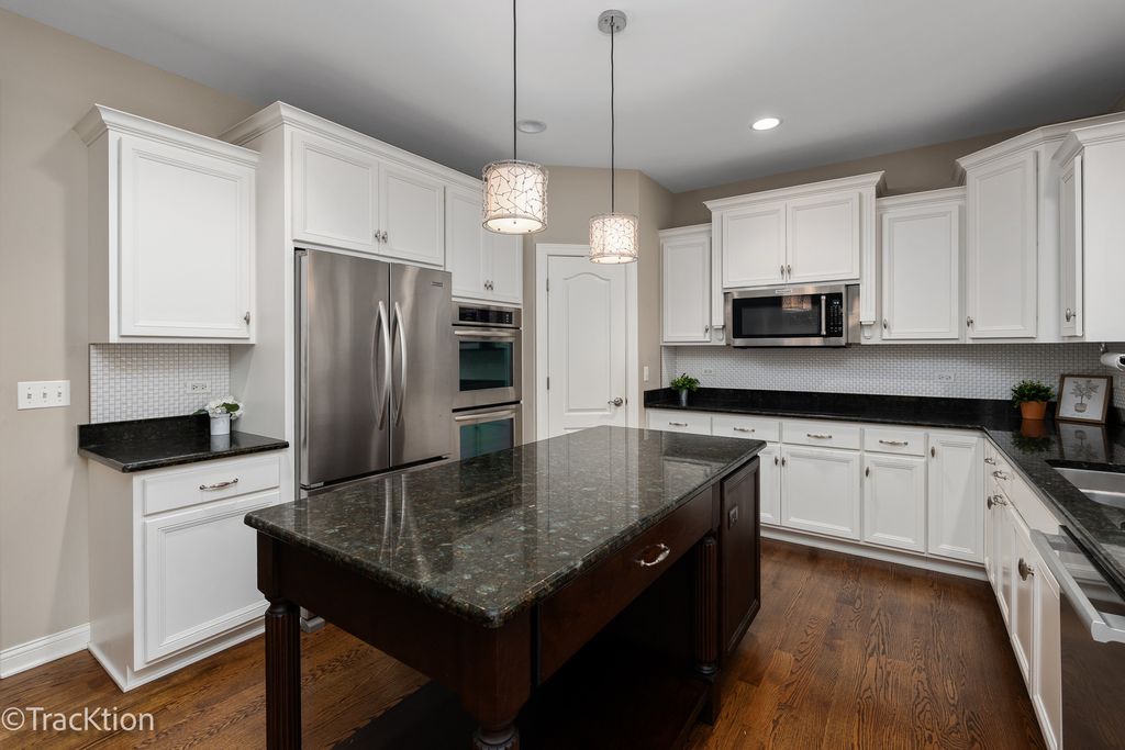 Be prepared to be impressed! This custom-built home shows like new construction and offers exceptional value. From the moment you enter the welcoming foyer, you'll notice the attention to detail throughout. The open gourmet kitchen features a custom island, KitchenAid stainless steel appliances including double oven, granite countertops with Minidual Bianco backsplash, pantry, pull-out drawers, hardwood floors, and Hansgrohe high-arc chrome faucet. The eat-in area overlooks a 200-foot-deep fenced yard with a private patio and built-in gas line for grilling-perfect for entertaining. The light and bright family room features a fireplace, included television, and custom Hunter Douglas remote shades. Formal dining room with wainscoting and hardwood floors is ideal for gatherings. A first-floor bedroom or office with hardwood floors and wainscoting plus a convenient powder room complete the main level. Upstairs offers a spacious loft, luxurious primary suite with tray ceiling, soaking tub, separate shower, and custom walk-in closet, along with a second bedroom featuring a custom closet organizer. Second-floor laundry includes pull-out cabinetry, laundry sink, and LG washer and dryer. Additional highlights include sprinkler system, alarm system (wired for interior cameras), Ring doorbell, water softener, battery backup sump pump, and Aprilaire humidifier. Attached two-car garage. Prime location close to parks, shopping, expressways, and award-winning schools!