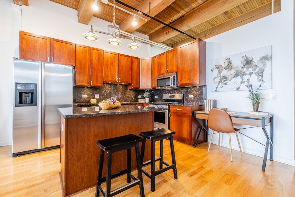 Welcome to 15th Street Lofts, an elevator building offering authentic loft living in the heart of the South Loop. This oversized 1-bedroom, 1-bath home spans nearly 900 sq. ft. and features dramatic 13-foot timber ceilings, floor-to-ceiling windows that fill the space with natural light, and engineered hardwood floors throughout. The open-concept layout provides a generous living and dining area anchored by exposed beams, with direct access to a large private balcony, perfect for enjoying west-facing downtown views and stunning sunsets. The kitchen is equipped with granite countertops, stainless steel appliances, and a functional island ideal for entertaining. The bedroom is spacious and offers excellent closet space. Building amenities include additional private storage, a shared roof deck and bike storage. A heated garage space is available for purchase for an additional $30k. Situated in a boutique, 78-unit elevator building, residents enjoy the perfect blend of character, comfort, and convenience. Steps from restaurants, coffee shops, parks, the lakefront, and public transportation, this home exemplifies quintessential South Loop living. The property is renter and pet friendly.
