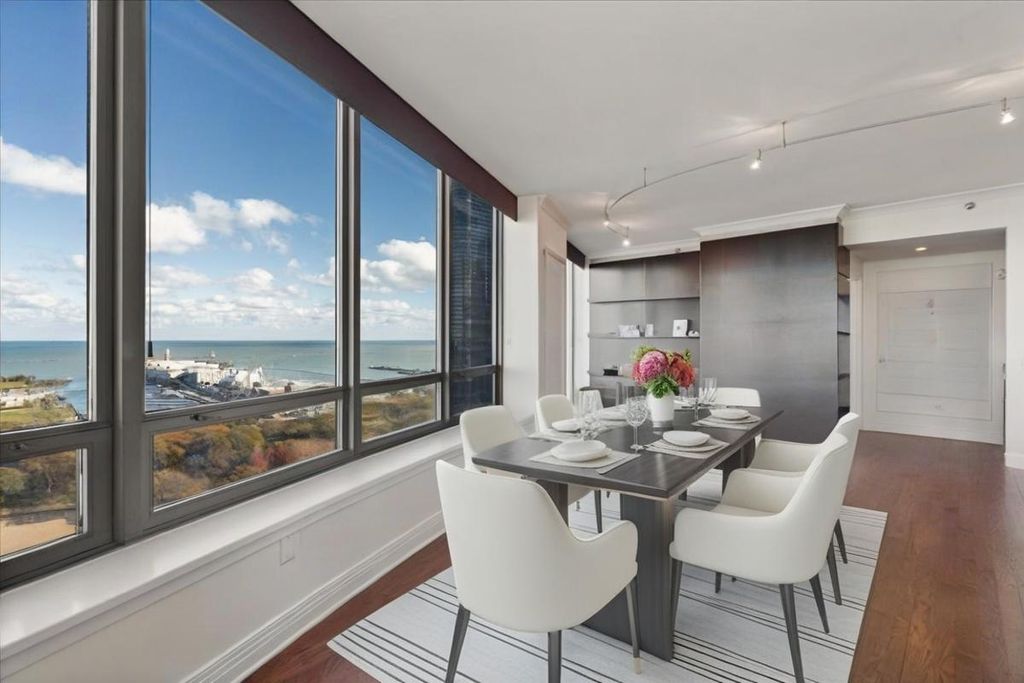 This rarely available large 3 bed 3.5 bath northeast corner residence features sprawling lake views along with Ohio St beach, Olive Park, and Navy Pier. Luxury living awaits, with spectacular northeast water views, custom flooring, crown molding and interior wall trim throughout, premium chef's kitchen, and its desirable split bed floor plan with abundant space, this condo is a destination property in the north tower at 600 Lake Shore Drive! With the open living/dining/kitchen floor plan, entertain with ease. An elegant overhead light fixture greets you upon entering, with custom marble flooring extending from the foyer into the hallway, leading to rich hardwood flooring in the living/dining area. The spacious living/dining area features crown molding along with overhead track lighting looping throughout the entire seating area with a custom floor-to-ceiling entertainment cabinet as a dramatic focal point in the room. This living/dining area also flows into an ideal seating area for enjoying a book by the custom gas fireplace with attached custom shelving and sweeping lake views. A conveniently located bar including built-in cabinets with custom glass doors and a wine fridge for yours and guests' enjoyment allowing a nightcap to end the day. Enjoy your morning coffee, or the evening nightcap on the north-facing private balcony with its calming lake views. Create culinary magic for guests in the enormous kitchen, boasting premium appliances including SubZero refrigerator, Bosch dishwasher, Wolf double oven, and Dacor microwave. You'll love the custom track lighting, custom backsplash, granite countertops, and rich cherry cabinetry featuring custom glass fronts. The oversized breakfast bar easily accommodates 4 full size seats and offers custom overhead lighting. The lavish master suite also offers lake views, custom carpet, crown molding, overhead custom light fixture, in-wall speakers, and features two large custom-built walk-in closets. The ensuite private master bath includes soaking tub with custom faucets, glass-surround walk-in shower with floor-to-ceiling marble, and dual vanity with custom faucets and all marble surrounds. The second bedroom also features custom carpet, north views, along with a custom walk-in closet and private balcony access. The second bath features marble flooring, along with a walk-in shower. The third bedroom, which can also serve as a den/home office, features lake and Navy Pier views and includes custom carpet, overhead custom light fixture, along with an ensuite bath featuring custom marble walk-in shower. The powder room is conveniently located off the foyer for guests which features a custom pedestal sink and designer mirror. The laundry room is off of the kitchen and accommodates a full-size side-by-side washer and dryer. This magnificent residence which exudes style and is loaded with upgrades could be yours! Prime low floor parking spots 459 is included in the price!