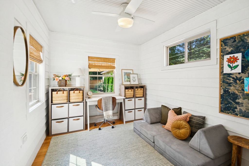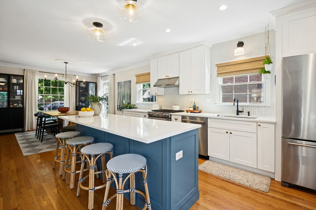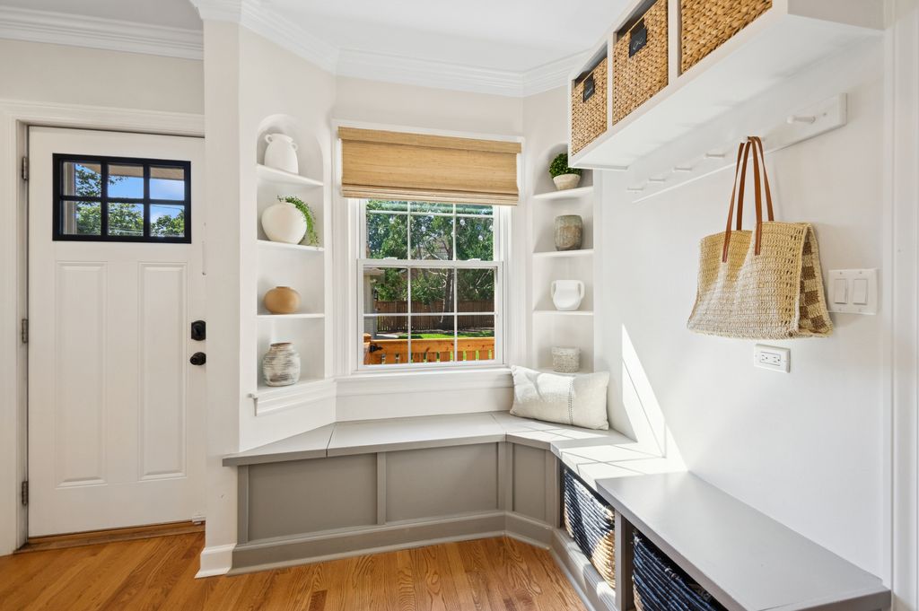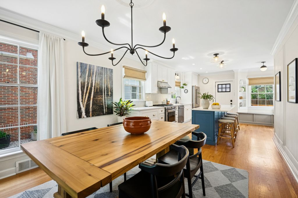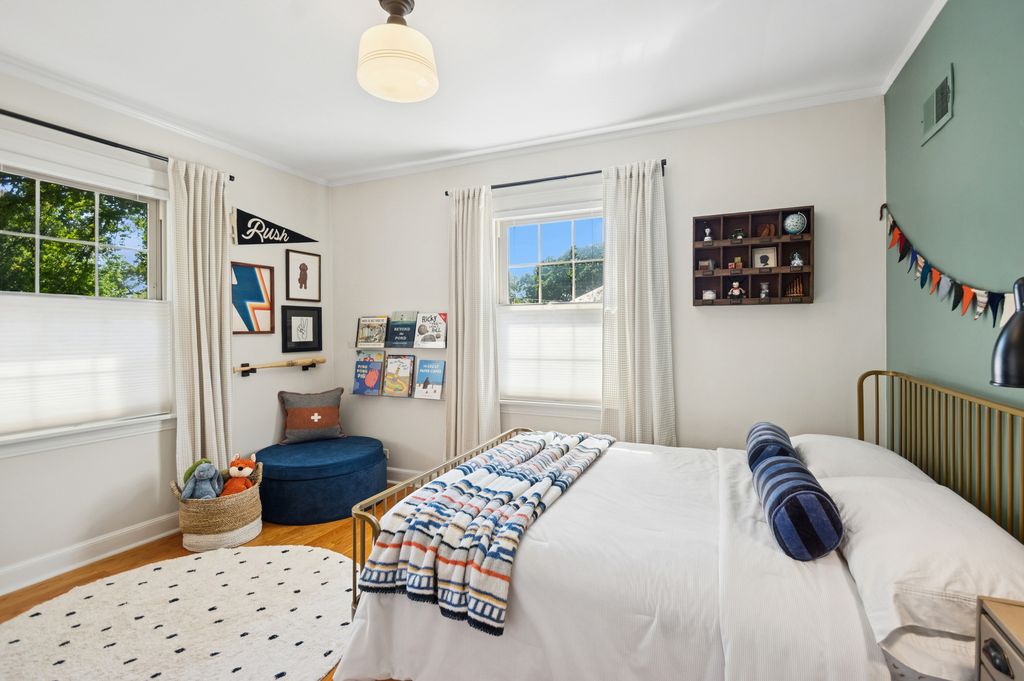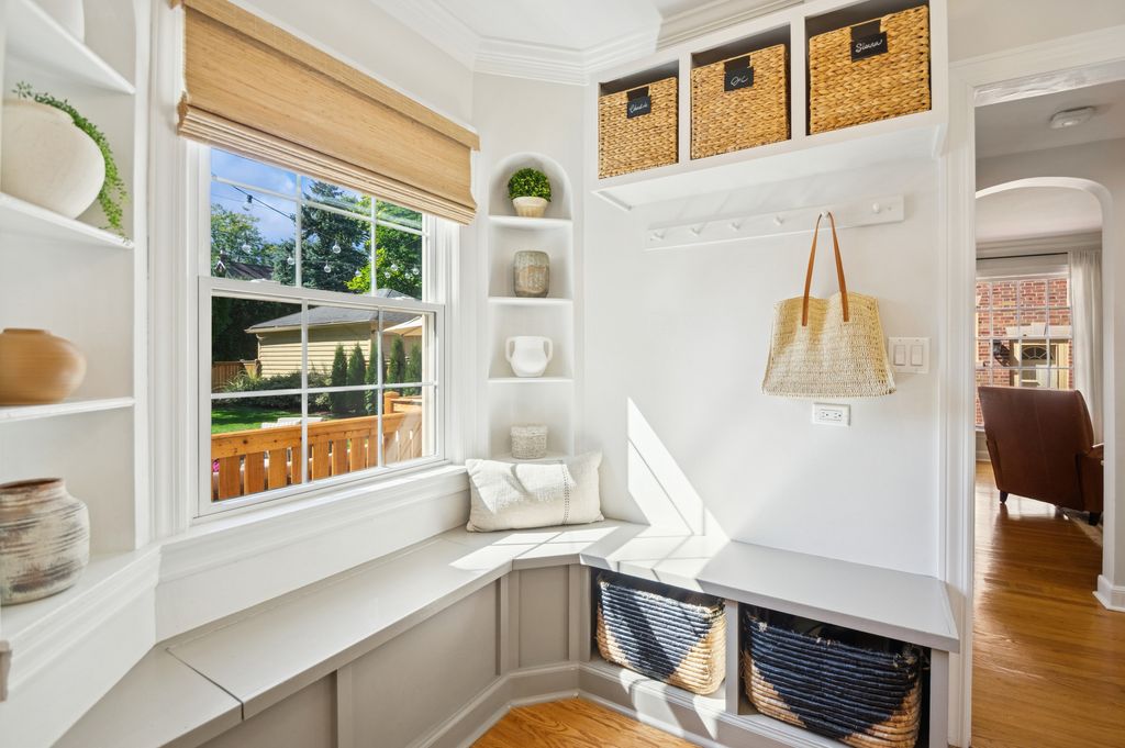 This Stately 1940s Brick Colonial tastefully combines vintage charm with a fresh and sophisticated interior for a contemporary lifestyle. The entire first floor has warm hardwood floors, oversized windows with elegant crown molding and arched doorways. The inviting LR is centered by a WB fireplace. A unique glass barn style door separates a light filled space perfect for an office. There is a large and sophisticated open concept kitchen and dining area. The kitchen has been tastefully updated and includes a unique and cozy corner seating area with views of the lovely backyard. There is also a convenient half bath on the first floor. A classic staircase takes you upstairs to the primary bedroom and 2 good sized bedrooms all light-filled from oversized windows. The beautifully updated bathroom has double sinks and a relaxing soaking tub. The finished basement has a welcoming and comfy family room, complete with a second WB fireplace and a second full bath with a walk-in shower. The oversized lot has large grassy area and brick paver patio with italian lights for outdoor entertaining plus a new 2-car garage. Recent updates: 2025 New 2-car garage, new basement ejector pump, 2024 Fireplace flue and firebox repaired & relined, 2022 New energy efficient furnace and humidifier installed, 2021 perimeter cedar fence installed, 2018 full kitchen remodel and expansion, touch screen, whole house security system installed, 2014 updated main floor half-bath. Fabulous location on a tree-lined street, just walking distance to everything Edgebrook, including the Edgebrook School, Metra, shops, and restaurants with easy access to 90/94, downtown and O'Hare. Stunning home in the heart of Edgebrook.