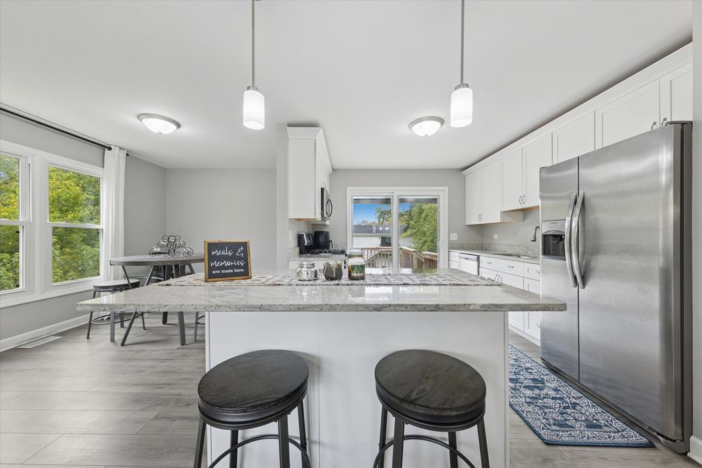 This stunning raised ranch perfectly blends modern style, comfort, and functionality in a highly convenient location. Rehabbed in 2020 and further upgraded since, the home now features an oversized 14x18 deck, sliding glass door with built-in blinds, a brand-new roof (2025), and professional landscaping for exceptional curb appeal and outdoor enjoyment. Step inside to an open-concept main level that's both bright and inviting. The gorgeous kitchen showcases crisp white cabinetry, granite countertops, stainless steel appliances, and a large island - ideal for cooking, entertaining, or casual dining. A thoughtfully designed layout connects the kitchen and living area while keeping the intimate dining space subtly defined. The main level offers three bedrooms and a beautifully remodeled full bath with a dual-sink vanity and generous linen closet. The lower level adds even more versatility, featuring a fourth bedroom (currently used as a home office), an additional full bath, a comfortable family room, and a laundry area with walk-out access to the back patio - perfect for guests or multi-generational living. Additional highlights include: * Oversized 2.5-car garage with abundant storage * Vinyl plank flooring in main living areas and neutral carpet in bedrooms * Newer windows for great natural light * Substantial concrete driveway with ample parking * Partially fenced yard that can easily be fully enclosed. Situated close to shopping, dining, schools, parks, public transportation, and major highways, this move-in-ready home offers the perfect combination of style, space, and convenience. Just move in and enjoy!