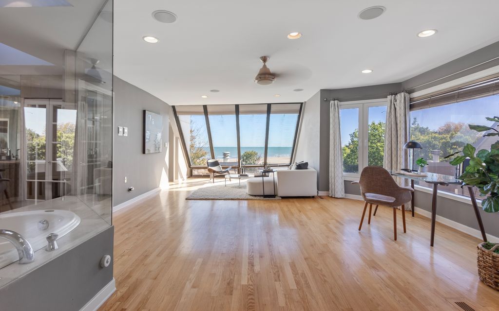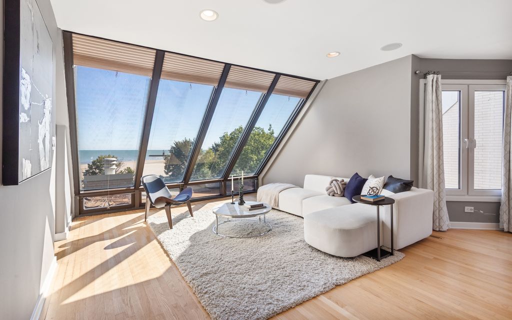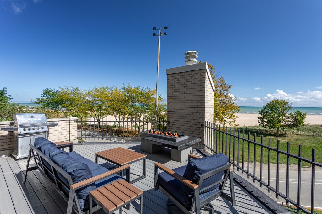 Beachfront property in Chicago! Truly one of a kind, this exceptional six-bedroom, five-and-one-half-bath with private elevator offers over 5,000 sqft of luxurious living directly on Hollywood Beach. Designed to capture breathtaking lake views & sunrises from nearly every room. This pet friendly residence combines modern elegance with timeless comfort while living in the security of a gated condominium. The main level features an open-concept layout with floor-to-ceiling windows, oversized gourmet kitchen breakfast bar, hardwood floors, entertainer sized dining area, European appliances & so much more. Third floor includes three bedrooms, two full bathrooms, laundry, living area including a wet bar complimented w/ a spacious private outdoor deck overlooking the beach and lake. The fourth floor is devoted to the primary suite expanding over 1,100 sq.ft. of private living space featuring a spa-inspired bath, multiple walk-in closets and a sitting room framed by stunning water views. The top level offers a bedroom (or office) with an en-suite bath and access to a spectacular 750 sqft. rooftop deck. The ground level includes a generously sized living space w/ fireplace, additional bedroom, full bathroom, gated grassed area & direct access to two separate private garages accommodating four cars+. Located in Edgewater's premier beachfront enclave, this rare property offers easy access to the Red Line and Lake Shore Drive. This is a must have property!