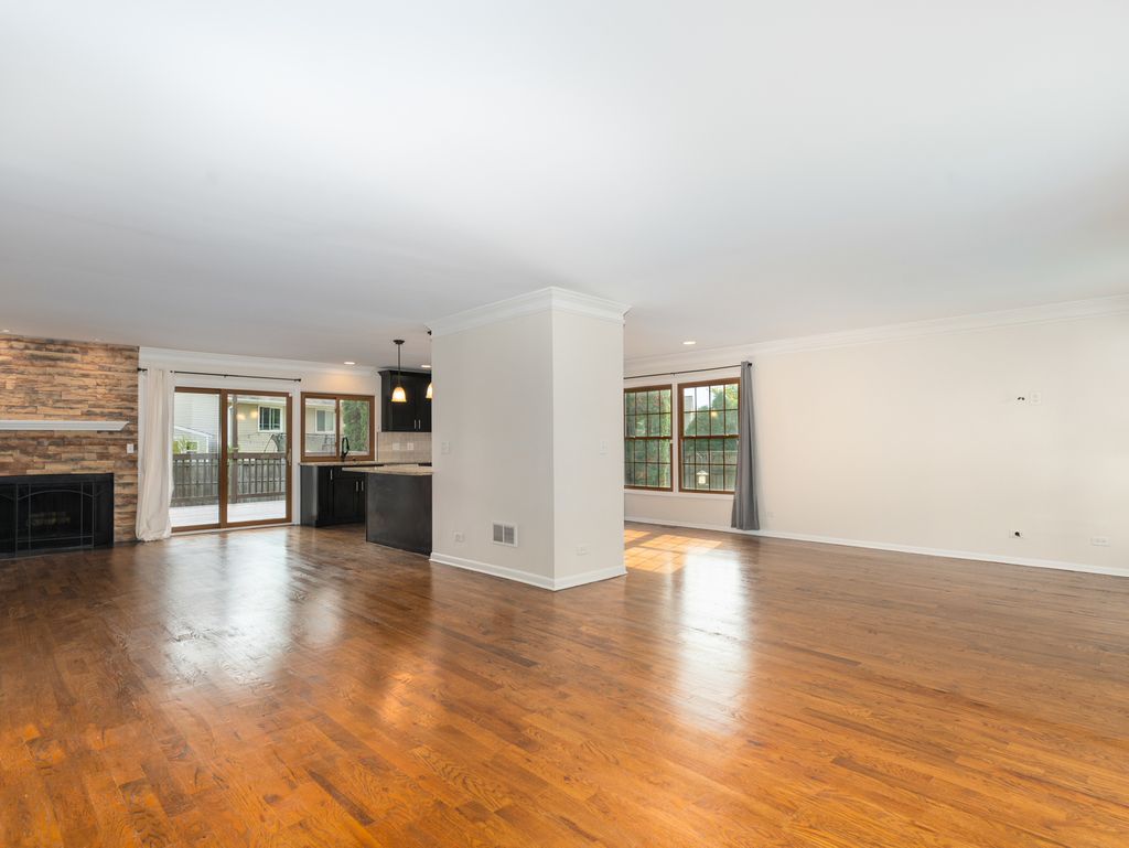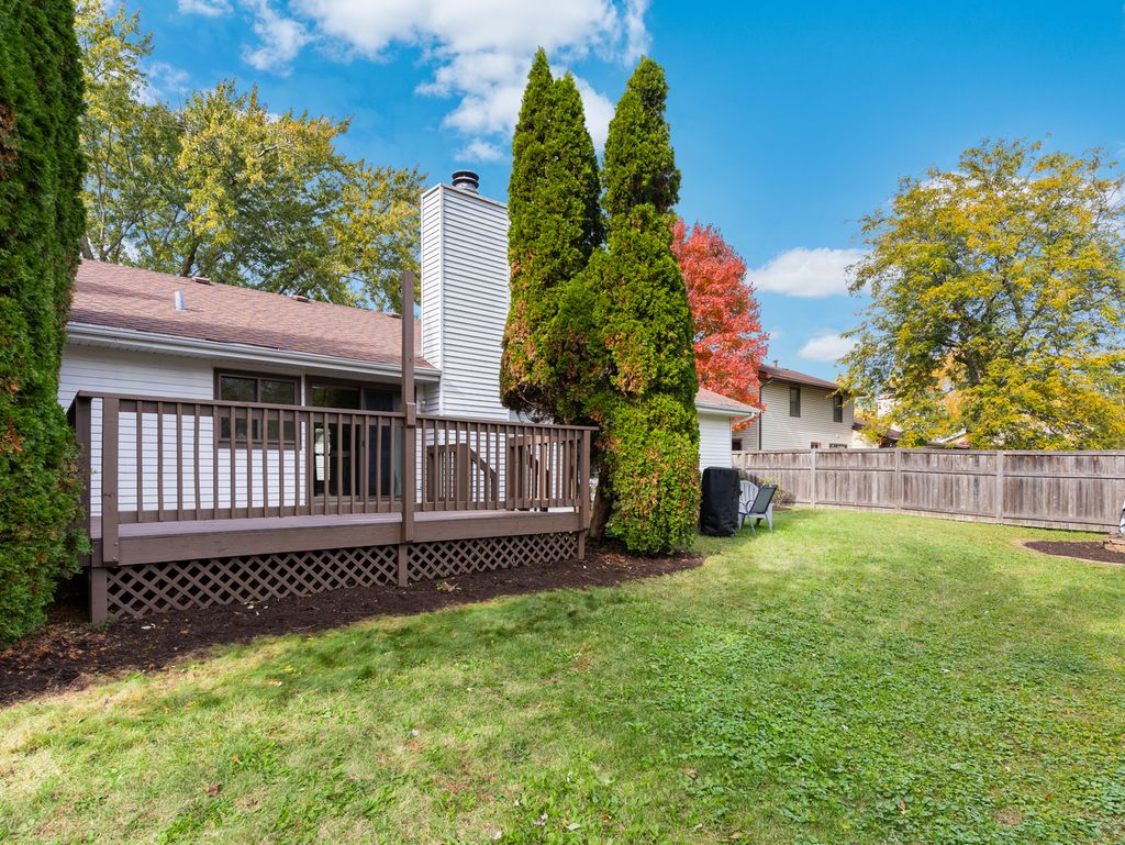Welcome Home! This beautifully updated ranch offers a fantastic open floor plan with stunning hardwood floors throughout. The spacious family room features a striking stone fireplace, crown molding, and opens seamlessly to the gorgeous kitchen. The oversized kitchen boasts custom cabinetry, granite countertops, a large breakfast bar, recessed lighting, a ceramic tile backsplash, and a pantry. Double doors lead to the primary suite with a generous closet and a fully updated bath featuring a walk-in shower. Two additional bedrooms and another updated full bath complete the main level. The home also includes a full unfinished basement, offering endless possibilities for future expansion. Perfect for entertaining, the fenced backyard features a deck, fire pit, and two distinct gathering areas-ideal for relaxing or hosting guests. Located just 1.5 miles from downtown Naperville, you'll enjoy easy access to the Riverwalk, shops, and restaurants. Truly the perfect home in the perfect location!