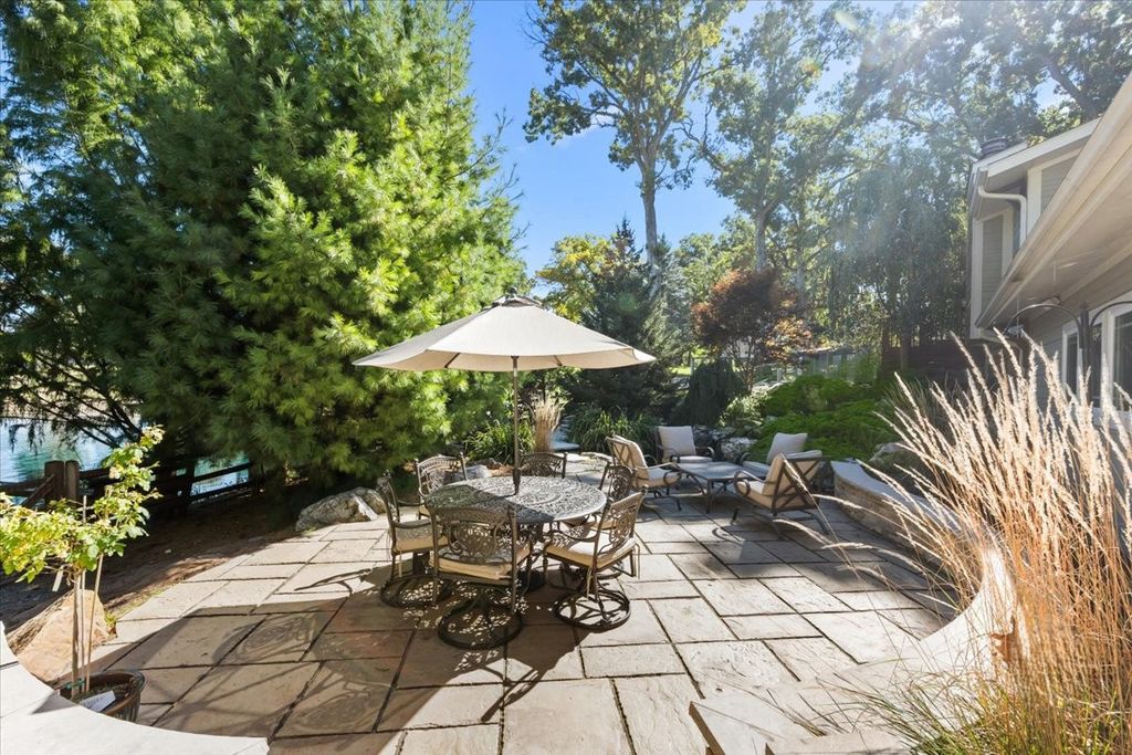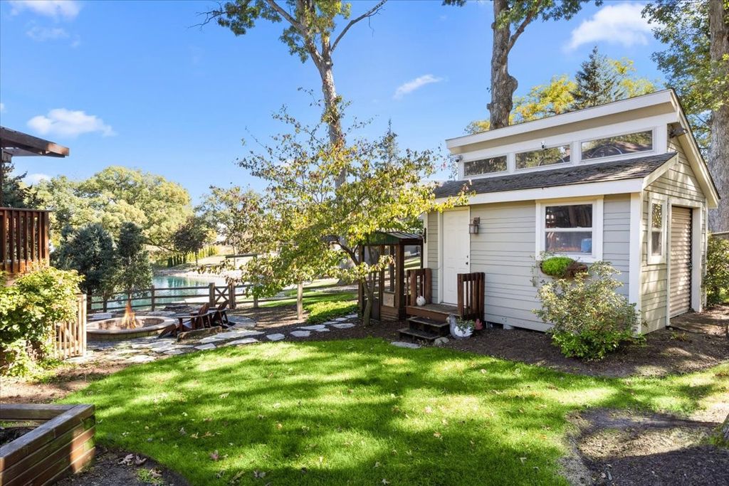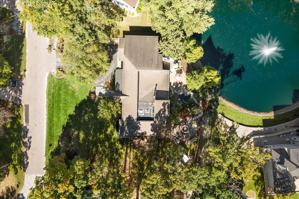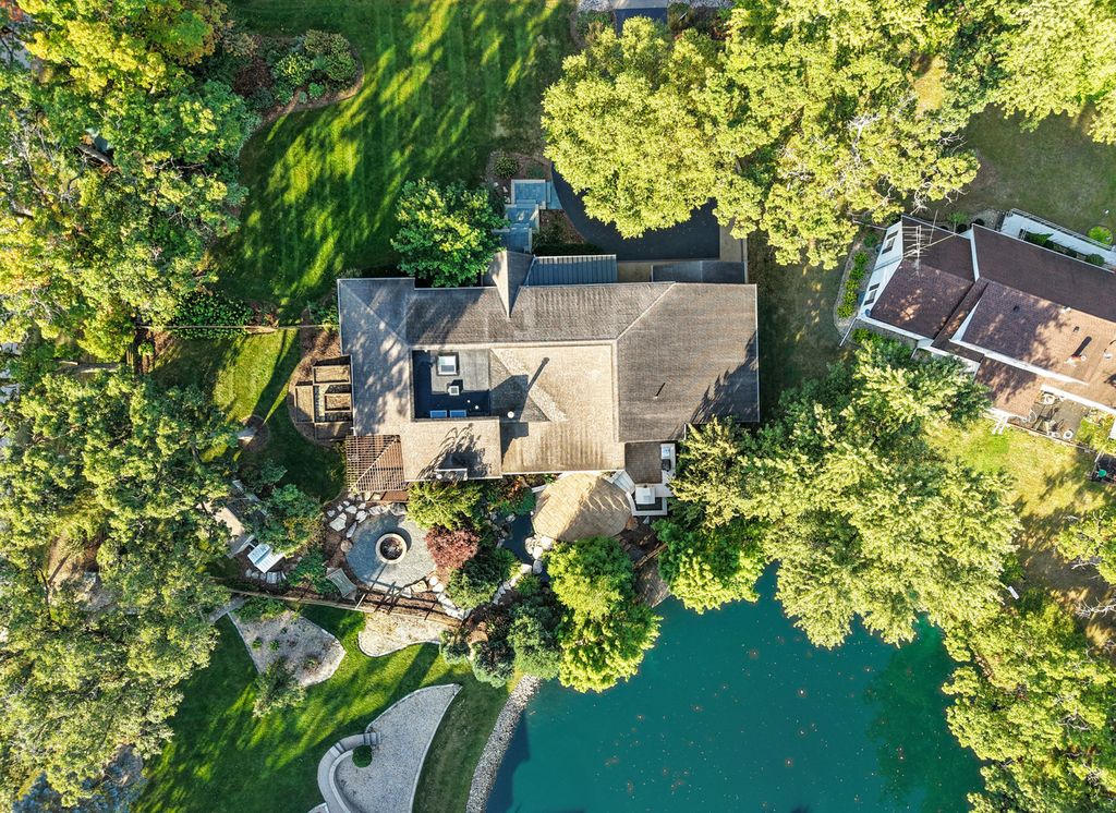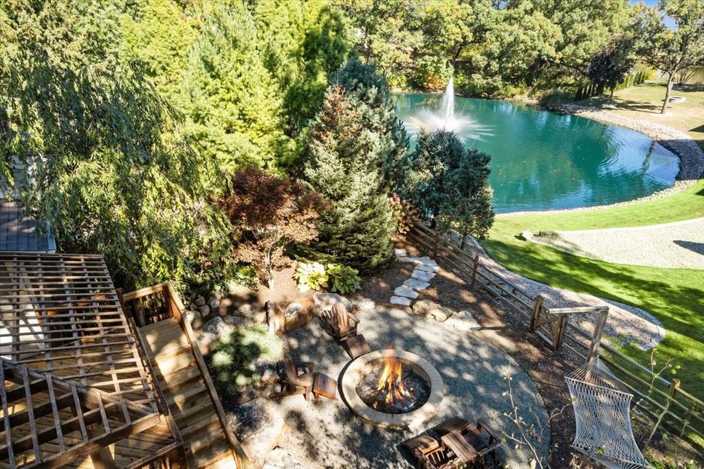 Experience resort-style living in this custom home filled with warmth, craftsmanship, and comfort. A blue stone walkway and Trex porch with a swing lead to a mahogany door and slate entry. Inside, the chef's kitchen features DCS commercial appliances, cherry cabinetry, quartz counters, and a wet bar, opening to a sun-filled great room with radiant floors and pond views. The main level offers 3 bedrooms, a den with a fireplace, and laundry. Upstairs, the primary suite boasts new carpet, pergola deck, walk-in closet, and a bathroom with Italian glass tile. A private in-law suite includes a kitchenette and bath. Outside, enjoy a DCS outdoor kitchen, pizza oven, fire pit, waterfall and pond, screened porch, She Shed, and treehouse. An attached 4-car heated garage features custom cabinetry and snow-melt driveway, a perfect blend of luxury, function, and serenity.