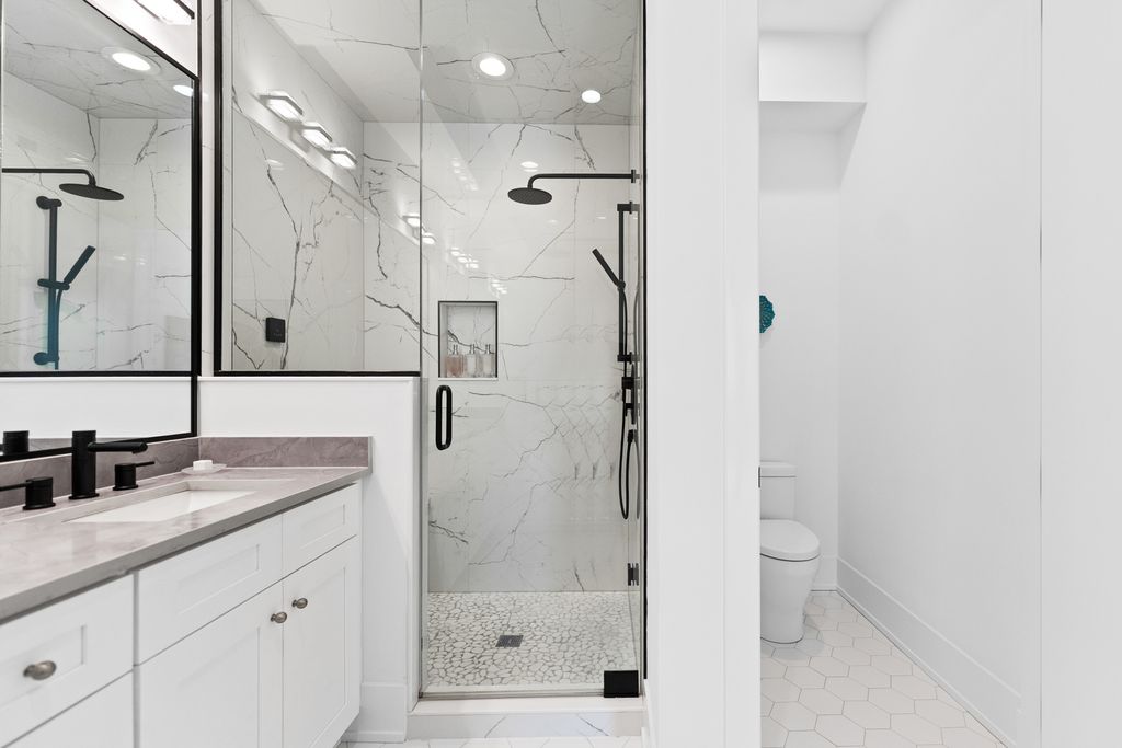 This gorgeous 3 bed, 2 bath Andersonville home offers the rare combination of new construction quality and meticulous owner improvements that elevate every detail. Built just over a year ago, the home has been maintained in pristine condition and thoughtfully customized with designer lighting from Visual Comfort and others, curated finishes, and timeless style throughout. The open-concept living and dining area features French white oak floors, 10-foot ceilings, a fireplace with custom built-ins, and a striking light fixture above the dining space. Floor-to-ceiling pleated drapery opens to a private balcony that fills the room with natural light. The chef's kitchen showcases Calacatta quartz waterfall countertops, a custom tile backsplash, premium appliances, and a dramatic range hood with brass accents. The spacious primary suite includes an oversized walk-in closet with custom built-ins and a statement chandelier, along with a serene bath featuring heated floors, a stone steam shower with bench, a private water closet, and a double vanity. Down the hallway are two additional bedrooms, each offering generous closet space and access to a beautifully designed full bath with custom tile, modern fixtures, and a double vanity. Additional highlights include a large laundry room, an oversized storage room, a separate kitchen pantry, and a coat closet. Heated attached garage parking and an additional storage cage complete the home. All in a boutique elevator building perfectly positioned on a quiet tree-lined street in a prime Andersonville location just steps from the new Metra station, Clark Street's vibrant shops and restaurants, the lakefront, and more!