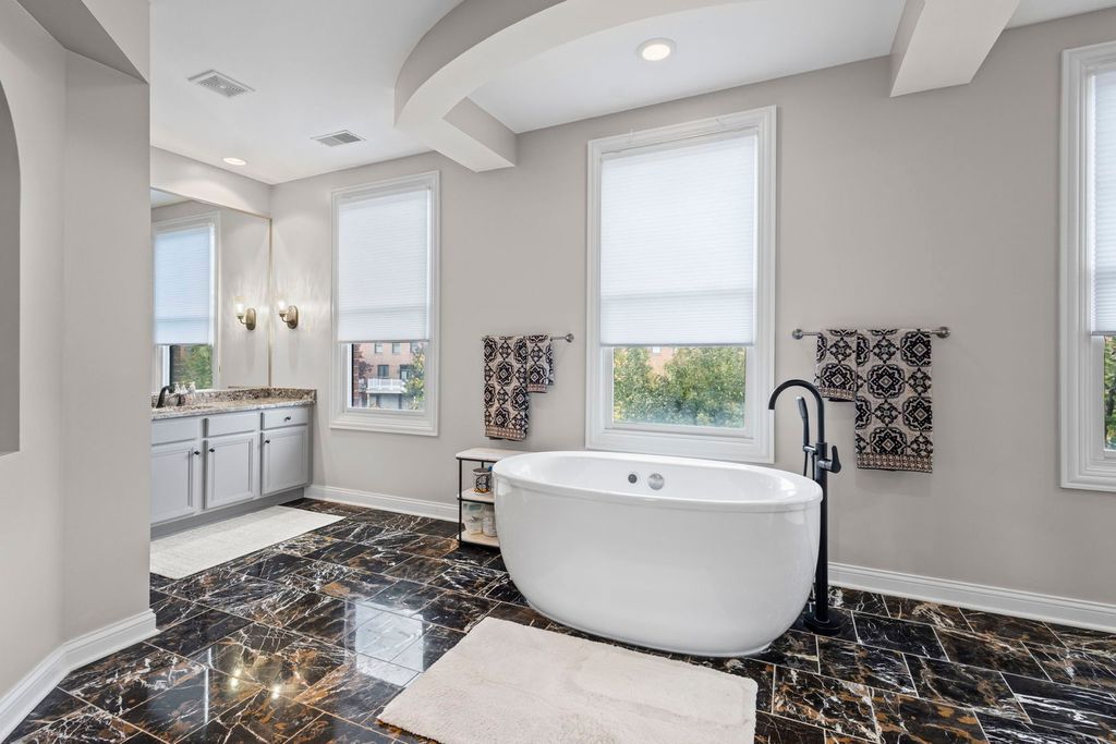 2005 Valor Court is a sophisticated, bright, and beautiful 4-story Georgian brick townhome in the heart of The Glen development, mere steps from Glen Town Center's upscale shopping, restaurants and movie theater. It features 3 bedrooms, 3.1 bathrooms, and 3210 square feet of refined living with many upgrades including hardwood floors and a majestic staircase. The spacious living room offers breathtaking architectural details including 13' cathedral ceilings, a bay window, ceiling fan and a lovely fireplace. The stunning kitchen, adjacent to the dining room, offers high-end stainless steel appliances, granite counters, custom backsplash, pantry closet, and an island. French doors lead to a large deck. The third floor is home to the striking owner's suite comprising a sizable bedroom with ceiling fan, a lovely separate sitting area, two large walk-in closets and a luxurious ensuite bathroom with his/her vanities, a soaking tub, and a separate shower. The laundry room is conveniently located off the owner's bedroom. The penthouse floor offers two more bedrooms with vaulted ceilings and a full bath. One bedroom boasts an arched window with plantation shutters. A handsome family room/office/bedroom and full bath are on the lower level. The home offers a two car attached garage with extra storage space. This remarkable home is walking distance to two golf courses, Gallery Park with jogging trails and playgrounds, Lake Glenview and the Glenview Park Center offering swimming, basketball and an impressive fitness center. The Glen's Metra train station is close-by with convenient service to Chicago's loop. 2005 Valor Court is not just a home, it's a lifestyle.