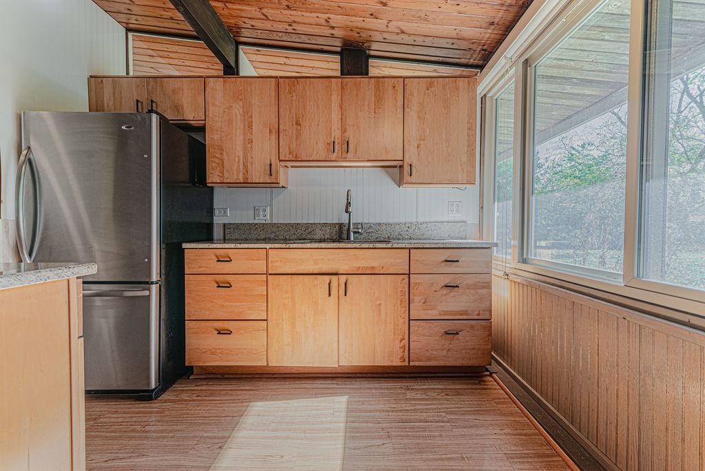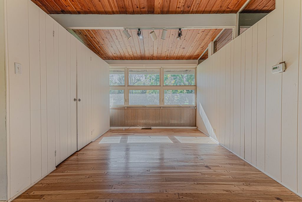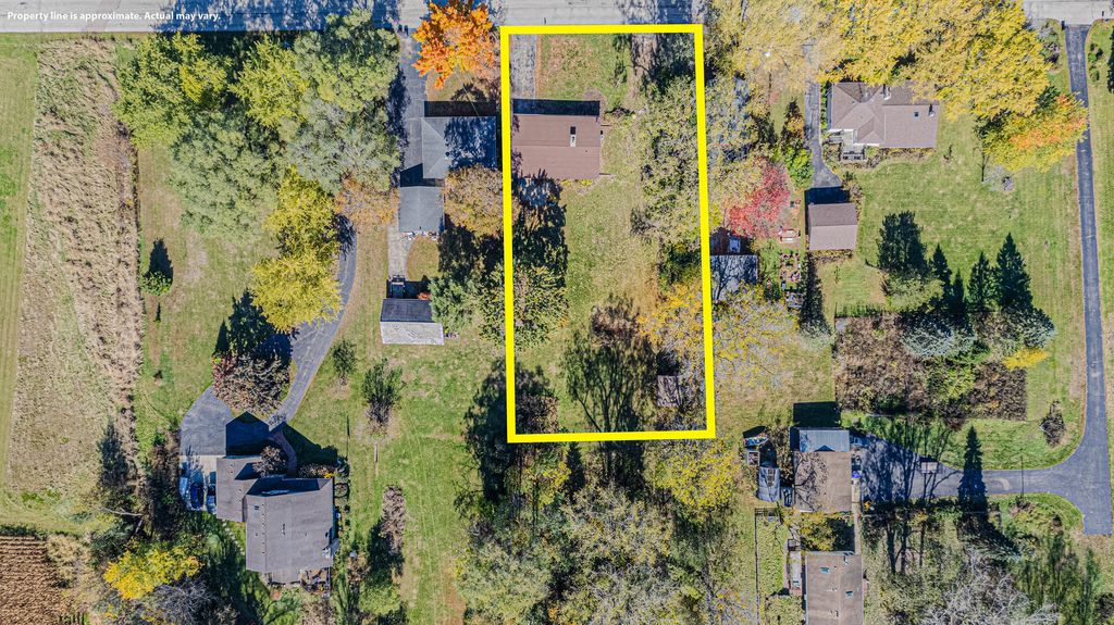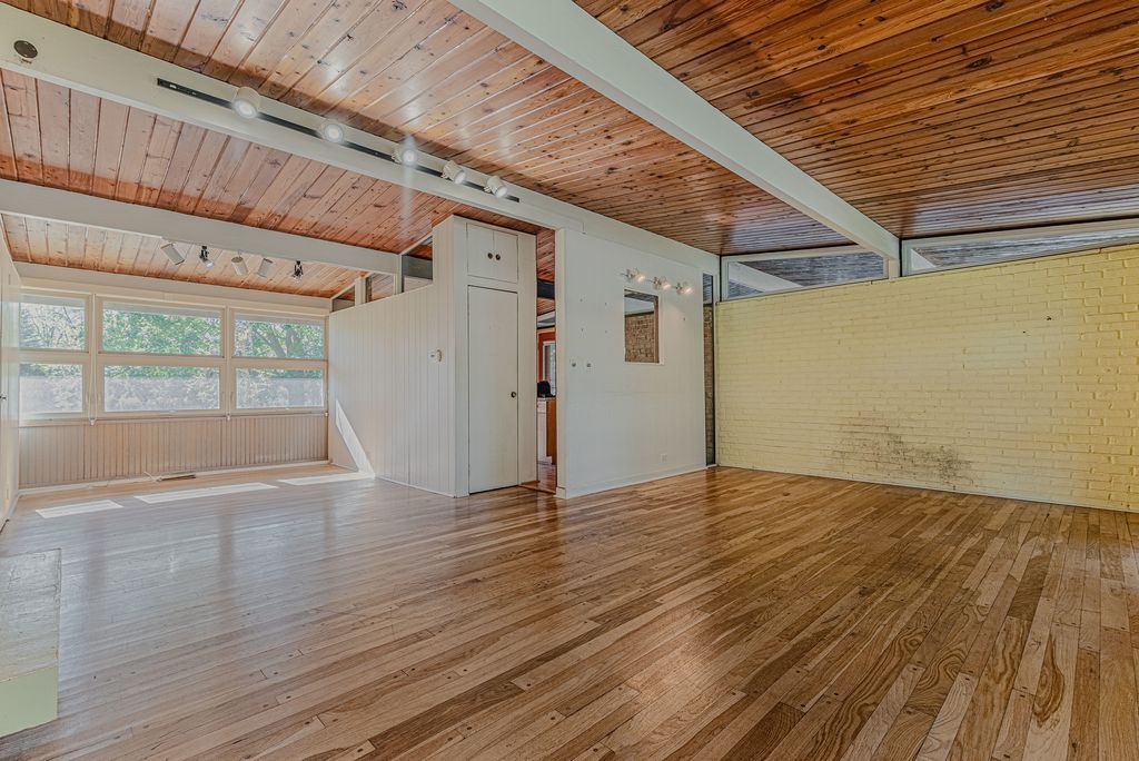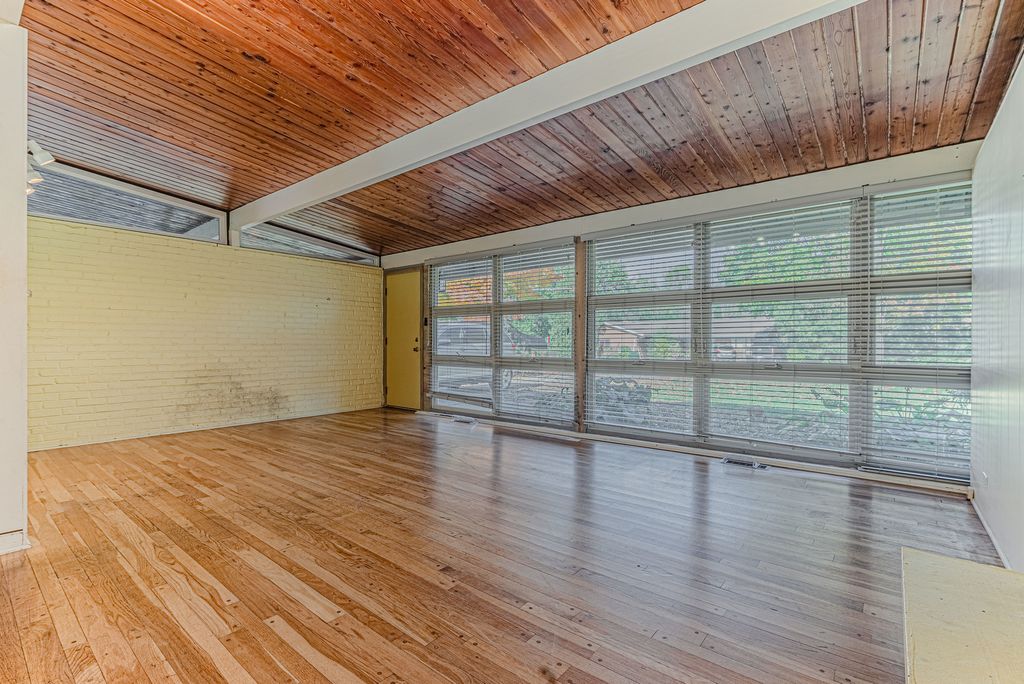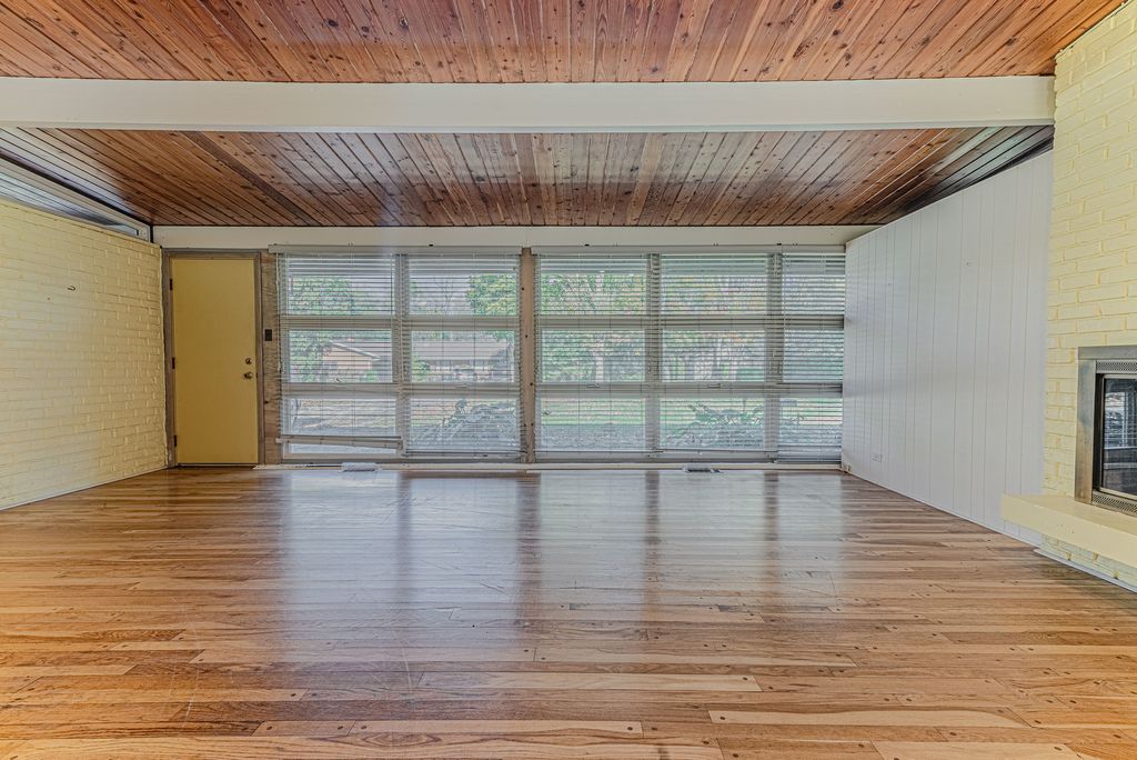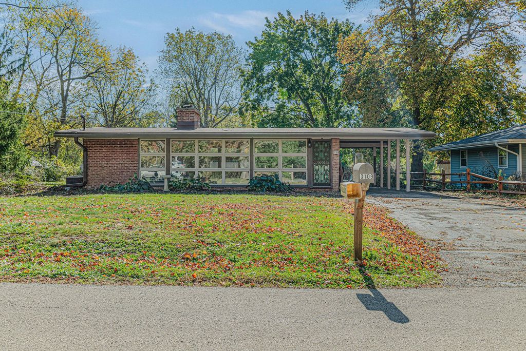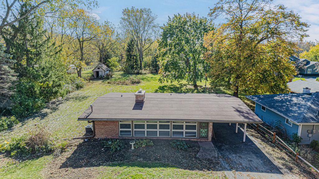 This stylish, architecturally interesting all-brick home sits on an oversized 1.55 ACRES parcel. Enter through the front door into a living room featuring a wall of floor-to-ceiling windows, a 9ft pitched ceiling, wood beams, directional lighting, upgraded window treatments, and fireplace with brick surround. Additional eating area adjoining the living room. Beautiful hardwood floors throughout the living and bedroom spaces. The kitchen features stone countertops, good condition cabinets, and large vinyl windows with view of the backyard. Sizable bedrooms. Full unfinished basement with finished bathroom. Carport parking. Large shed. Selling AS IS!