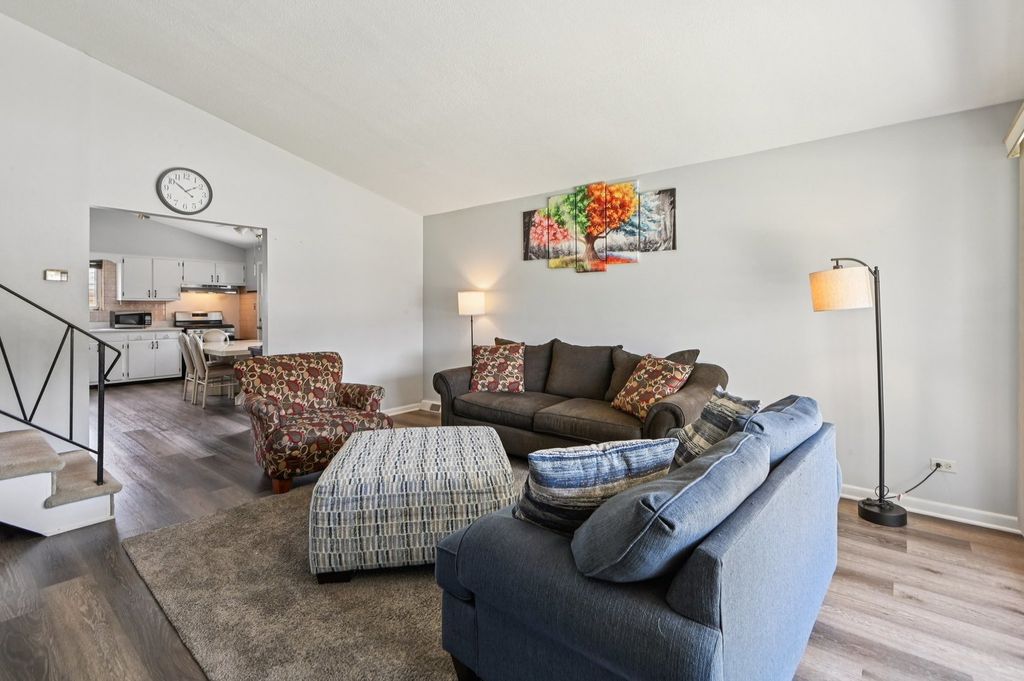 OPPORTUNITY! BUYERS FINANCING FELL THROUGH. Charming split level home with vaulted ceilings and a nice open floor plan. Updated wood laminate flooring throughout the main level. Eat-in kitchen has a SS refrigerator, oven range and hood, quartz countertop, sink and faucet. Plenty of cabinetry for storage and a pantry. The spacious living room has a big picture window and open views of the kitchen and second level. Three bedrooms on the second level share a full bathroom. Great in-law or extended family arrangement on the lower level with a family room, kitchenette, and full bath with a shower. Most recent updates include - Windows (11 yrs), furnace (6 yrs), and roof is less than 4 years old. Driveway leads to an oversized 2.5 car garage with a separate attached storage shed. Metra station is 2 blocks away and expressway is less than a mile.