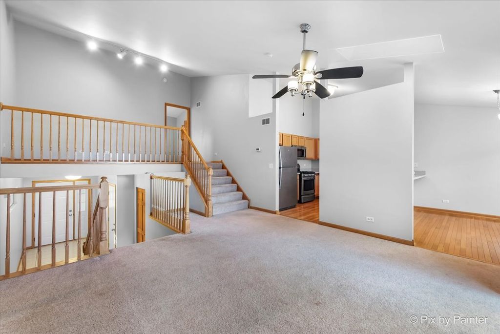 Welcome Home to this turn-key 2 Bedroom, 2 Bathroom End Unit! Step into a bright, open-layout ready for your personal touch. The living room features vaulted ceilings, skylights, and a sliding glass door leading to a private patio that fills the space with natural light. The open-concept kitchen offers newer stainless-steel appliances (including a 2025 refrigerator and dishwasher), great cabinet space, and an eat-in area ideal for everyday dining or entertaining. Upstairs, the loft provides a flexible space for an office, reading nook, or lounge. The primary suite includes an ensuite bathroom with dual sinks and a large walk-in closet. The lower level offers additional living space perfect for movie nights or guests, along with a second bedroom, full bathroom, and walk-out access to another patio. Enjoy the convenience of a 2.5-car garage, providing extra room for storage or hobbies. Major mechanicals are updated for peace of mind: Roof, A/C, and Water Heater (2017) and Furnace (2018). Located in a quiet, well-maintained neighborhood near shopping, parks, major highways, train access, and the public library.