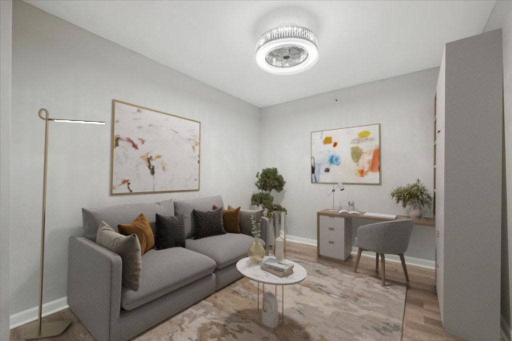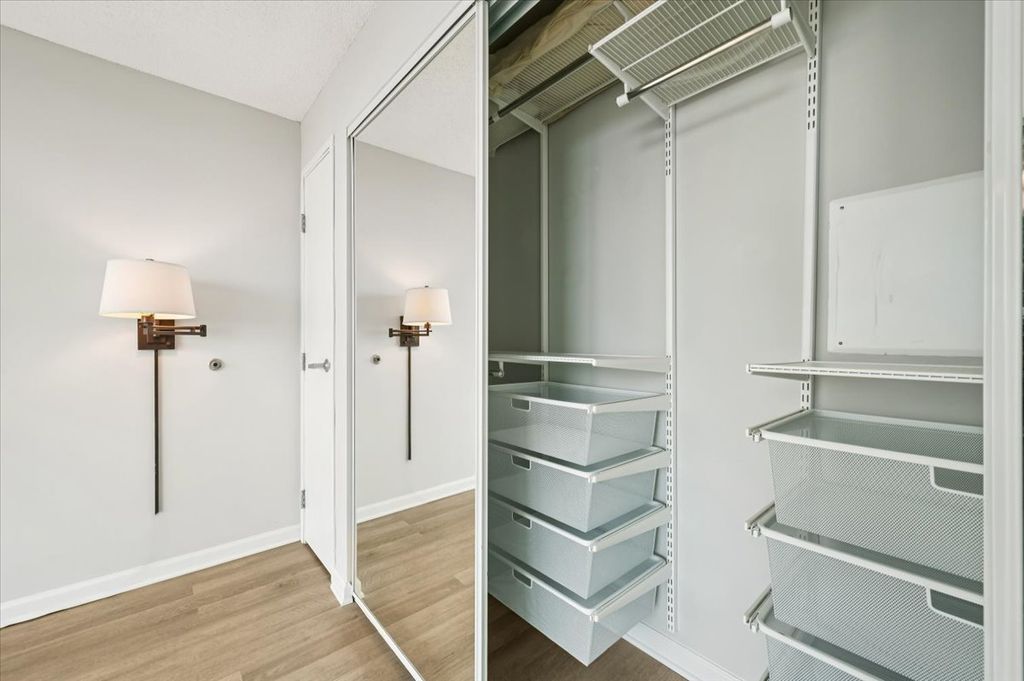 Enjoy beautiful lake and city views from floor to ceiling windows in this immaculately maintained ONE bedrooms PLUS Den. The centrally located galley kitchen offers abundant prep and storage space. The kitchen's location divides the large main area into two (2) additional spaces - a substantial dining area and considerably sized living space. The den offers flexibility of living and can be used as a guest room, office or even a dining room. The unit is positioned at the bend of building's hallway which provides extra space for a large additional closet. All closets are custom designed with multiple drawers and plentiful hanging space. The luxury vinyl flooring throughout the home is a soft shade of grayish/tan complimented by walls painted a peaceful shade of frost grey. The unit is complimented by a large covered balcony with electric, full set of appliances including a flat cooking surface as well as a stacked washer and dryer. The Optima Horizons is a full amenity building offering door staff, indoor heated pool/hot tub, outdoor patio with tables and grills as well as a well designed fitness center. Unit 1013 transfers with indoor parking and a full sized storage cage. This is a prime downtown location with easy access to Northwestern University, the Metra, El (purple line), restaurants and retail.