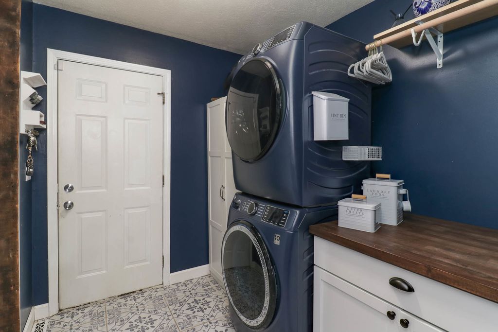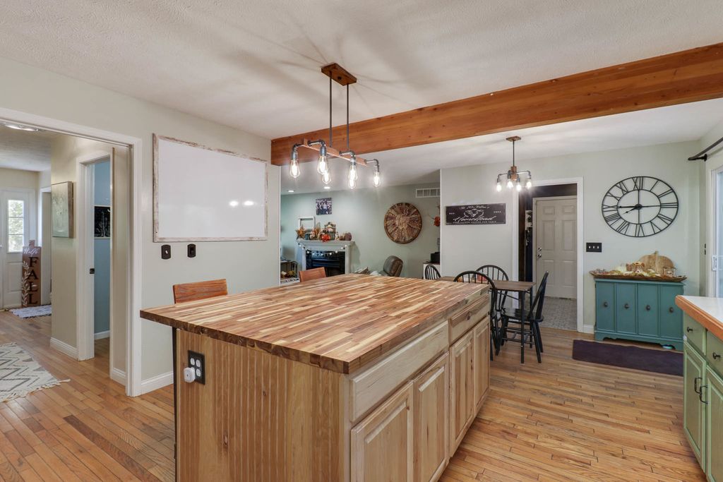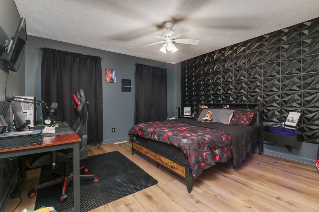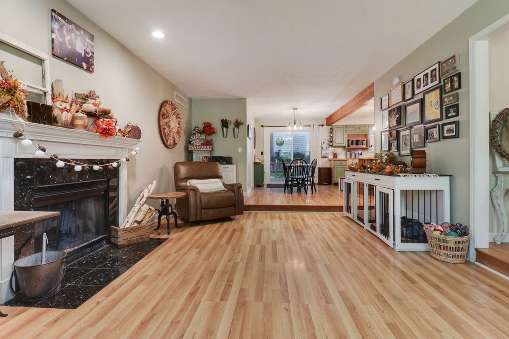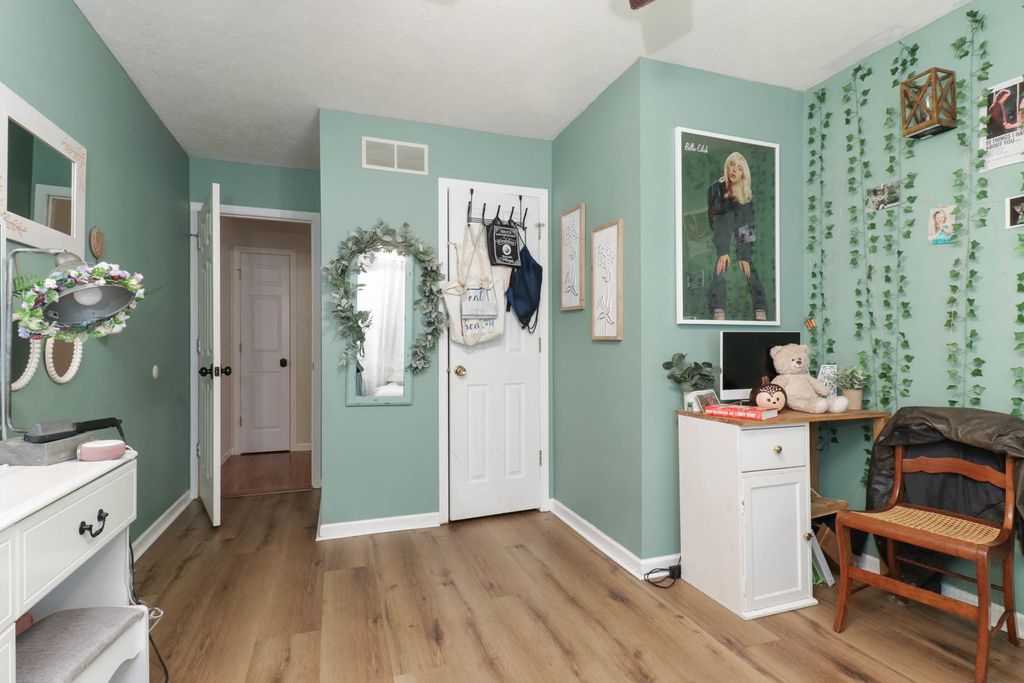 Beautiful 2-story placed regally on a raised corner lot in Woodland Ridge featuring 5 spacious bedrooms (all on the 2nd floor), 3.5 baths and updates galore! On the first floor find a large eat-in kitchen w/ new island cabinets and butcher block countertop (2023), all appliances updated (2023) with exception of refrigerator (2025). Opens to the sunken family room w/ wood burning fireplace and spacious living room and dining room. New flooring throughout those rooms. Hall half bath updated with new vanity, toilet and paint (2024). Laundry room reconfiguration and updates with the addition of pantry space and new washer/dryer (2024). Upstairs find FIVE spacious bedrooms, and two full baths. The primary bedroom has a vaulted ceiling, walk in closet & en suite bathroom! The 4 additional bedrooms have brand new LVP flooring (2025). Finished lower level includes huge family room, other room & full bath! Side load 2 car garage with additional storage! Additional patio cement poured (2020), pergola addition (2021). All New Windows (2025), New HVAC (2024), Water Heater (2023). Exterior painted (2024). Newer light fixtures throughout. Roof (2016). Must see! Fenced.