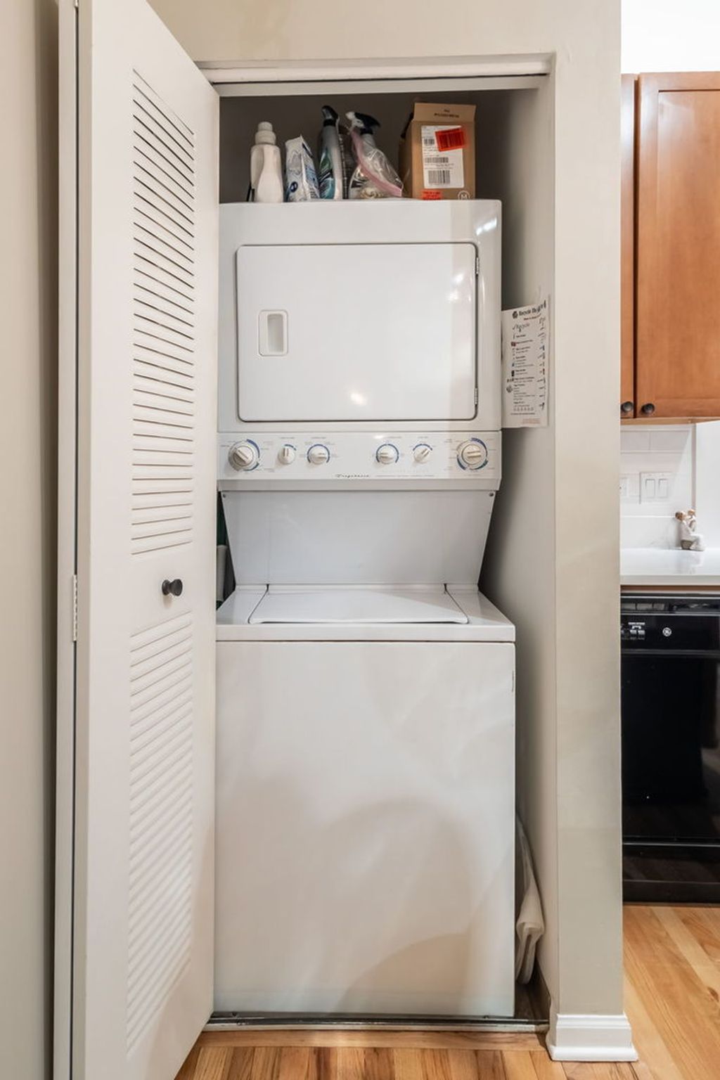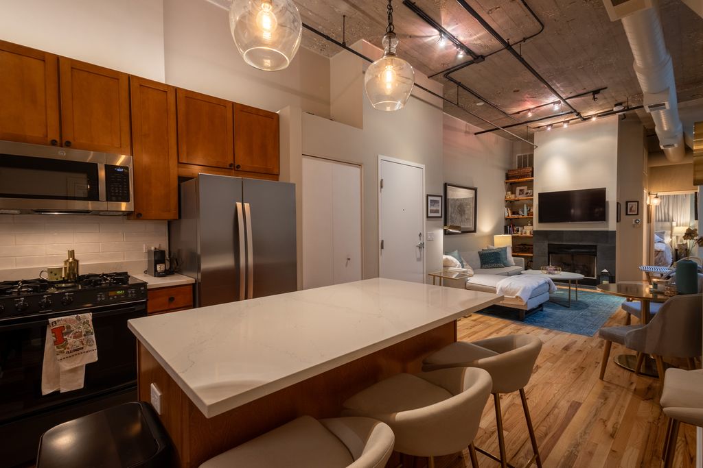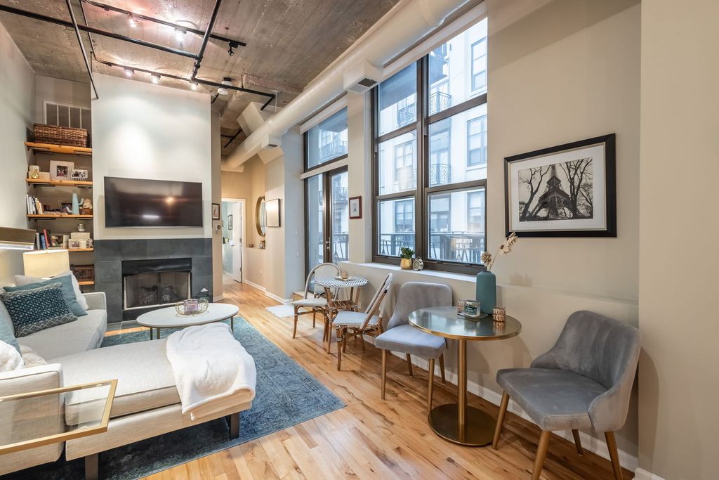 Come view this impeccably maintained one bedroom loft in the highly desirable One River Place! This concrete loft boasts 12 foot concrete ceilings, hardwood floors throughout, and an updated kitchen with newer quartz counters including an island with breakfast bar seating and plenty of prep space. The chef's kitchen also includes stainless steel appliances, custom cabinetry, backsplash, and designer influenced pennant lights. The living room is surrounded by oversized windows that lead out to a private balcony, and the gas fireplace makes for a beautiful focal point in the room. The well-sized bedroom provides ample custom closet and storage space. The bathroom includes a tub/shower combo with newer plumbing fixtures. And with the in-unit laundry closet, laundry day is a breeze! 1 deeded (and heated) garage parking spot available for $35K.This building is aptly named as it sits right on the Chicago River with access to the riverwalk, multiple parks, not to mention some of the finest restaurants, shopping, and entertainment Chicago has to offer! Building amenities include a beautiful and expansive roof/sundeck with incredible views, gas grills, 24 hour door staff, fitness center, bike room, extra storage cage, and dry cleaner on site. Come see this home today!