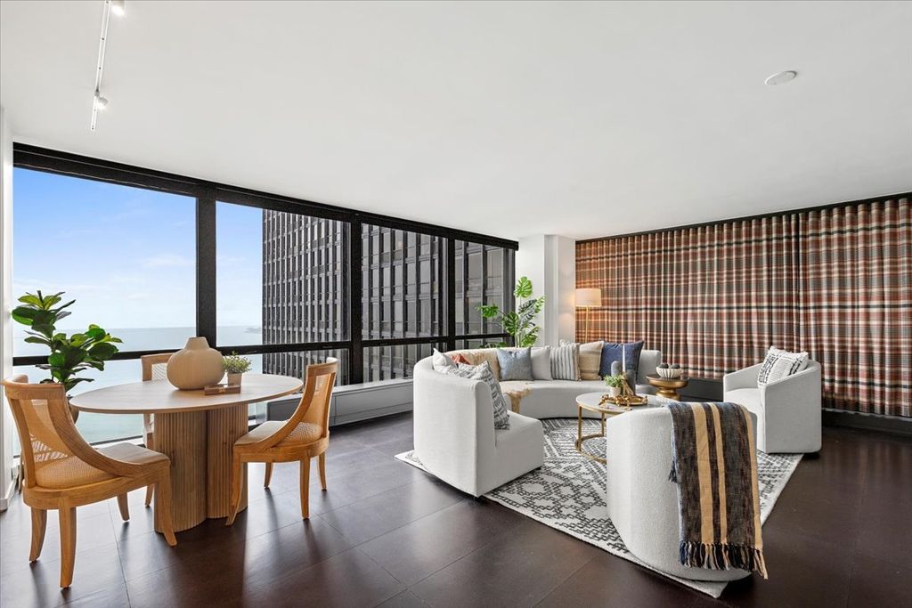 Spectacular, totally rehabbed apartment w/ panoramic unobstructed views of Lake Michigan from floor-to-ceiling windows, in full-amenity iconic Mies Van Der Rohe bldg. Stunning high-end materials were used throughout this custom renovation, which offers a refined, minimalist aesthetic, and no surface was left untouched. Features expansive living rm w/ custom A/V cabinet w/ birch bark doors. Dining rm that easily accommodates a large table. Gourmet kitchen w/ custom built-in cabinets, integrated high-end appliances, custom steel open shelving w/ LED lighting, Ann Sachs tile backsplash & honed marble countertops. Designer spa bth features luxurious Ann Sachs tile & custom Tadelakt plaster walls. Large bedroom offers 14 feet of professionally organized California closets w/ two full-length mirrors & custom LED lighting. Whisper-quiet cork flooring & LED mini track lighting run throughout the apartment, creating a sleek, modern atmosphere. Building offers 24-hour door staff, storage, bike storage, commissary, on-site management & sundeck w/ views of the Lake & Navy Pier. Short wait list (about 2 to 3 months) for rental parking in attached, heated garage. Low assessment includes cable and internet - all you pay is an electric bill. Steps to Oak Street Beach, Michigan Avenue shopping, Chicago's finest restaurants, the Museum of Contemporary Art, Lakeshore Park & all that the Gold Coast & Streeterville have to offer.