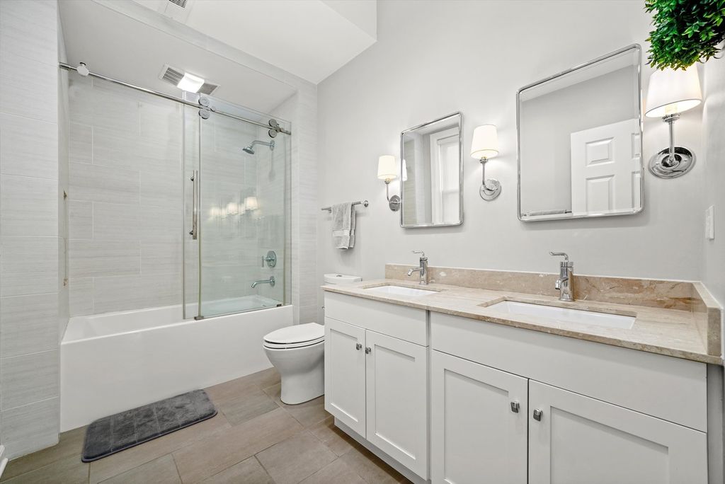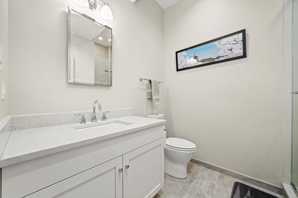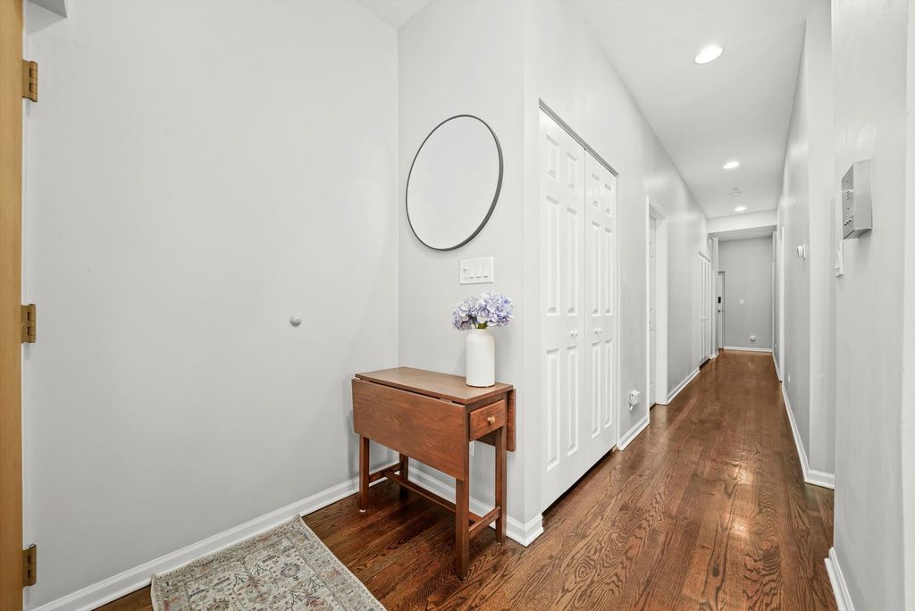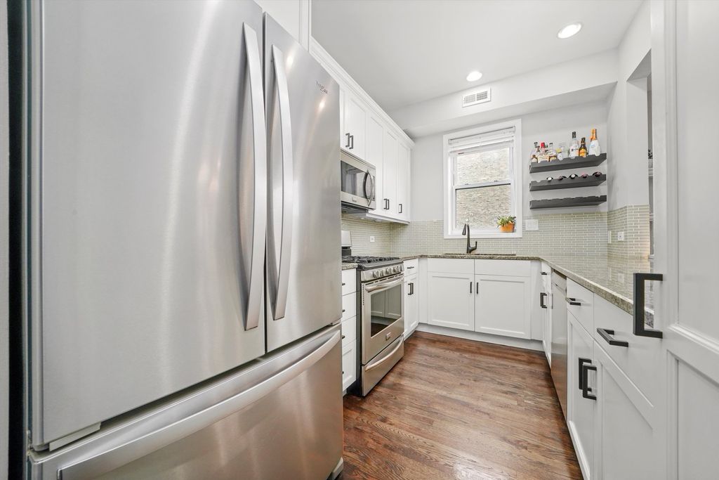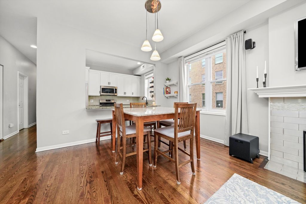 Welcome home to this bright, airy, and beautifully updated 2-bedroom, 2-bath condo perfectly situated in the heart of Lakeview, just steps from the vibrant Southport Corridor. This sun-drenched end-unit walk-up is filled with natural light throughout the day, thanks to its open south and east exposures. The spacious living area features a charming wood-burning fireplace with a classic wood mantel, a gas starter, and built-in surround sound-creating the perfect setting for relaxing or entertaining. Adjacent to the living space, the dining area offers ample room for a full table and is highlighted by a custom chandelier. The open floor plan flows effortlessly into the kitchen, which showcases crisp white cabinetry, stone countertops, a glass tile backsplash, stainless steel appliances, and a generous island with breakfast bar seating. Walnut-stained hardwood floors run throughout the home, complemented by excellent closet space, including a large front coat closet for added convenience. Retreat to the gracious primary suite, complete with a custom-organized walk-in closet and a luxurious en-suite bath featuring marble and stone finishes along with Restoration Hardware and Kohler fixtures. The second bathroom has been fully updated with the same high-end touches. Enjoy morning coffee or evening gatherings on your private rear deck, accessible from the primary bedroom. Additional features include a two-car tandem parking space and a private 10x8 lower-level storage room. With the El, Whole Foods, Target, boutique shopping, and some of Lakeview's best restaurants just steps away, this home perfectly blends comfort, style, and convenience in one of Chicago's most desirable neighborhoods.
