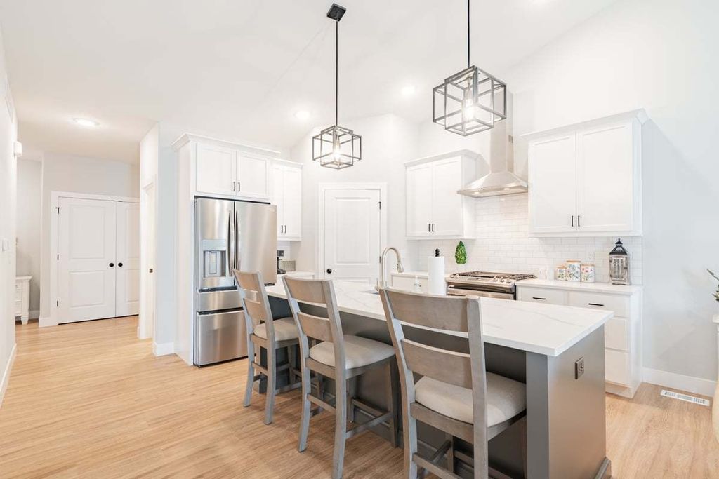 Beautiful and well-maintained 3-bedroom 3 full bathroom, duplex designed for easy living! Enjoy low-maintenance living with the HOA covering lawn care and snow removal. The home features brand-new kitchen and laundry appliances, along with a stunning kitchen showcasing quartz countertops, soft-close cabinets, a spacious island with bar seating, and an open layout flowing into the vaulted living room with a charming stone fireplace. The primary bedroom includes an en-suite bathroom and walk-in closet, while the main level also offers a second bedroom, full bathroom, and convenient laundry area. The attached oversized two-car garage provides ample storage and parking space. The partially finished basement adds a large family room, third bedroom, and full bathroom-plus additional unfinished storage space and a sump pump with battery backup. Custom blinds are installed throughout for a polished touch. Monthly HOA fee includes: access to the community pool, fitness and activity rooms, lawn care, mowing, and snow removal.