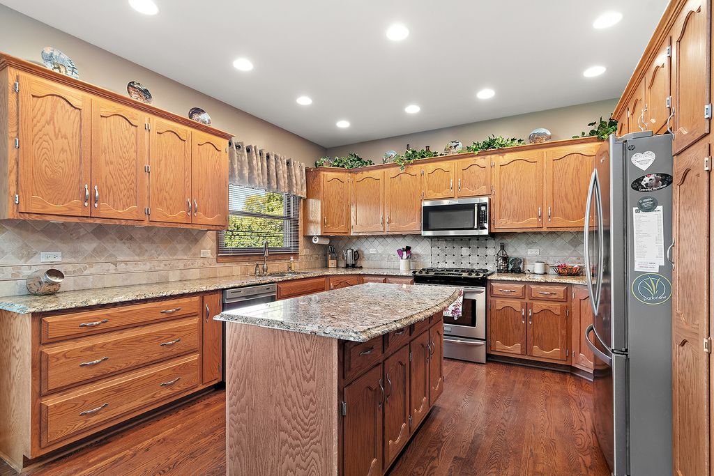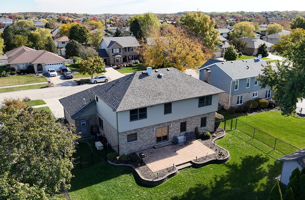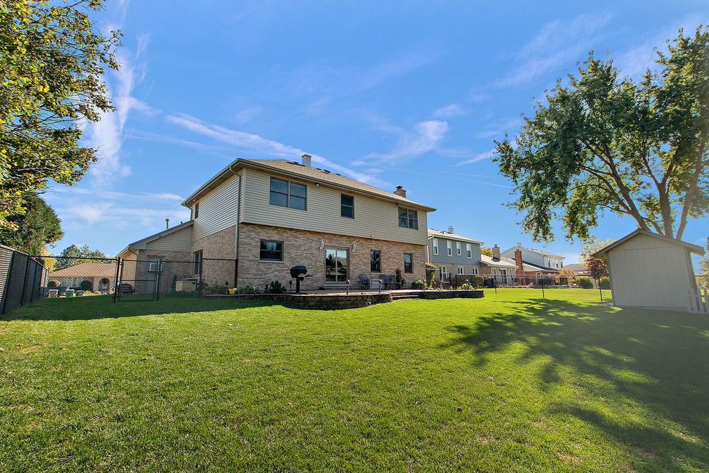 Welcome to this well-maintained Orland Park home. Walkable to the Centennial Elementary School and park. Close to shopping, dining, and all the amenities the area is known for. Curb appeal pops with a brand-new roof, siding, and gutters. Inside, a smart layout features a loft and four upper-level bedrooms including a primary suite with a decorative ceiling, jetted tub, vanity, and walk-in closet. Convenient upstairs laundry. The main level flows from a double-door entry living room into a cozy family room with a brick fireplace; the dining room also features a decorative ceiling. The kitchen shines with hardwood floors, granite countertops, a complementing backsplash, stainless steel appliances, a center island, and a planner's desk. Most windows have been recently replaced with Marvin double hung windows. Garage lovers: you'll appreciate this 8 foot tall garage door and 29' wide x 23.5' deep 3-car garage. With floor drains, hot/cold water with a wash tub, plus its own AC unit and heater, this garage is ideal for projects year-round. The finished basement is a standout with a large recreation area, gaming zone, and a full bathroom. Perfect for movie nights, play space, or party hosting. New Pella slider leads to stamped concrete patio and an oversized shed for extra storage. This is a move-in-ready home with practical upgrades and fantastic spaces throughout.