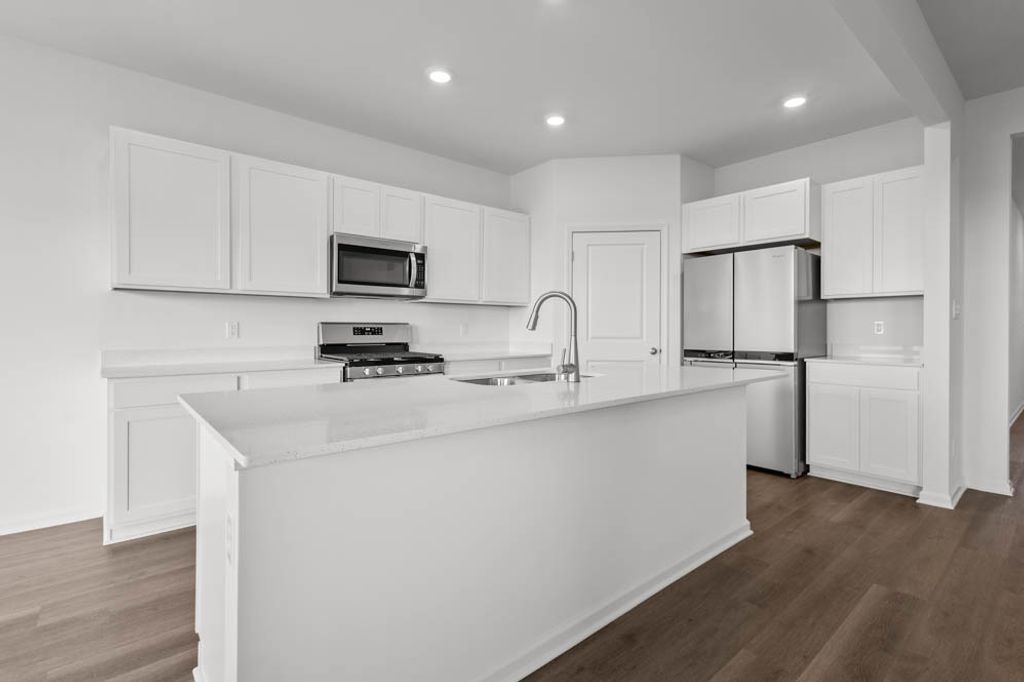 Envision yourself at 310 Astor Ct, a beautiful new home in West Point Gardens community. This ranch home will be ready for a winter move-in! Scenic homesite includes fully sodded yard and covered back patio. This Fairfield plan offers 1,981 square feet of living space with a flex room, 3 bedrooms, 2 baths, and 9-foot ceilings. When you first enter the home, there is a secondary bedroom, and a full bath. Down the hall, you will pass the hallway to the other secondary bedroom and laundry room, and pass the flex room as you walk into the open concept great room and kitchen. The kitchen layout includes a large island with an overhang for stools, 42-inch designer cabinetry with crown molding and soft close drawers. Additionally, the kitchen features a walk-in pantry, modern stainless-steel appliances, quartz countertops, and easy-to-maintain luxury vinyl plank flooring. Enjoy your private get away with your spacious primary bedroom and en suite bathroom with a raised height dual sink, quartz top vanity, and walk-in shower with clear glass shower doors. All Chicago homes include our America's Smart Home Technology. Photos are of similar home and model home. Actual home built may vary.