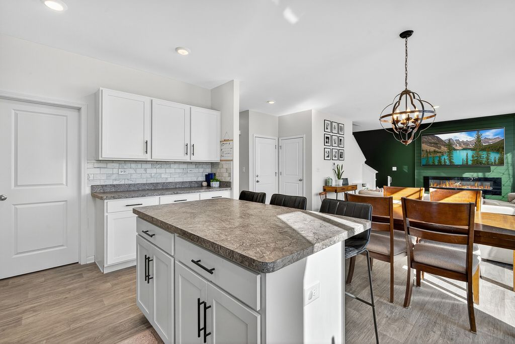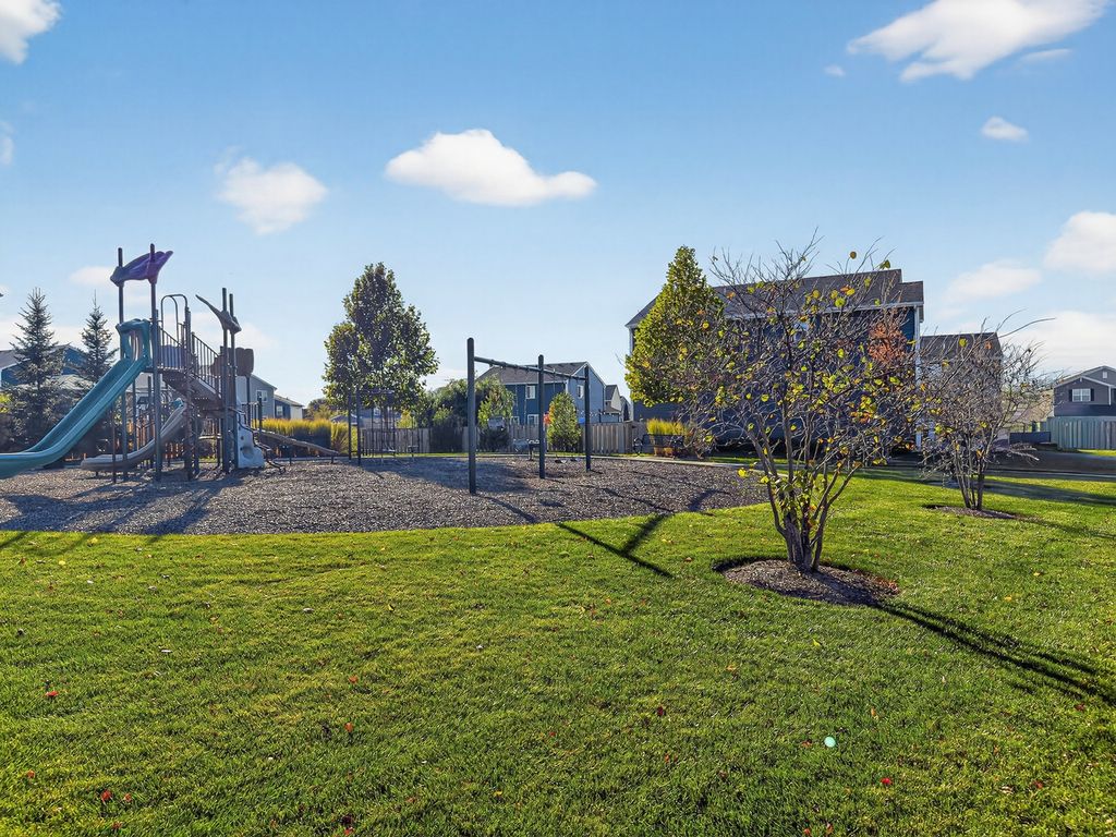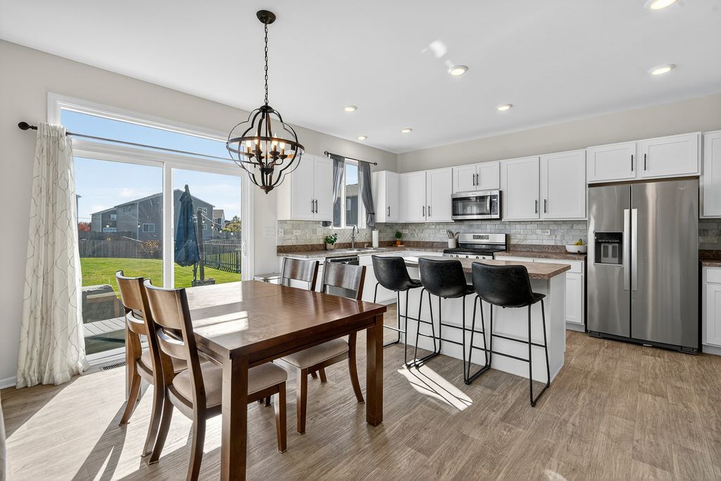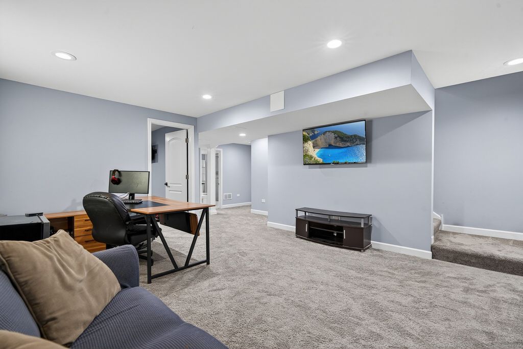 This popular Dearborn model has been upgraded to include a full finished basement and a fenced quarter-acre lot, one of the largest in the neighborhood. Enjoy the convenience of a playground within walking distance. With over 3,200 square feet of finished living space and 3.5 baths, this home offers plenty of room for comfortable living. The eat-in kitchen features white shaker cabinets, an island with a breakfast bar, stainless steel appliances, and a walk-in pantry. The bright family room with new feature wall and fireplace opens to the kitchen and overlooks the spacious fenced backyard. The newly created office space with French doors is perfect for a den, library or working from home. Upstairs includes an open loft and three bedrooms, including a large primary suite with three closets. The primary bath features a walk-in shower, double-bowl comfort-height vanity, linen closet, and a window for natural light. The professionally finished basement includes a full bath, a bedroom with two closets, a recreation room, and an office. Cambridge Lakes residents also enjoy access to community amenities, including a clubhouse, pools, ponds, fitness center, and more.
