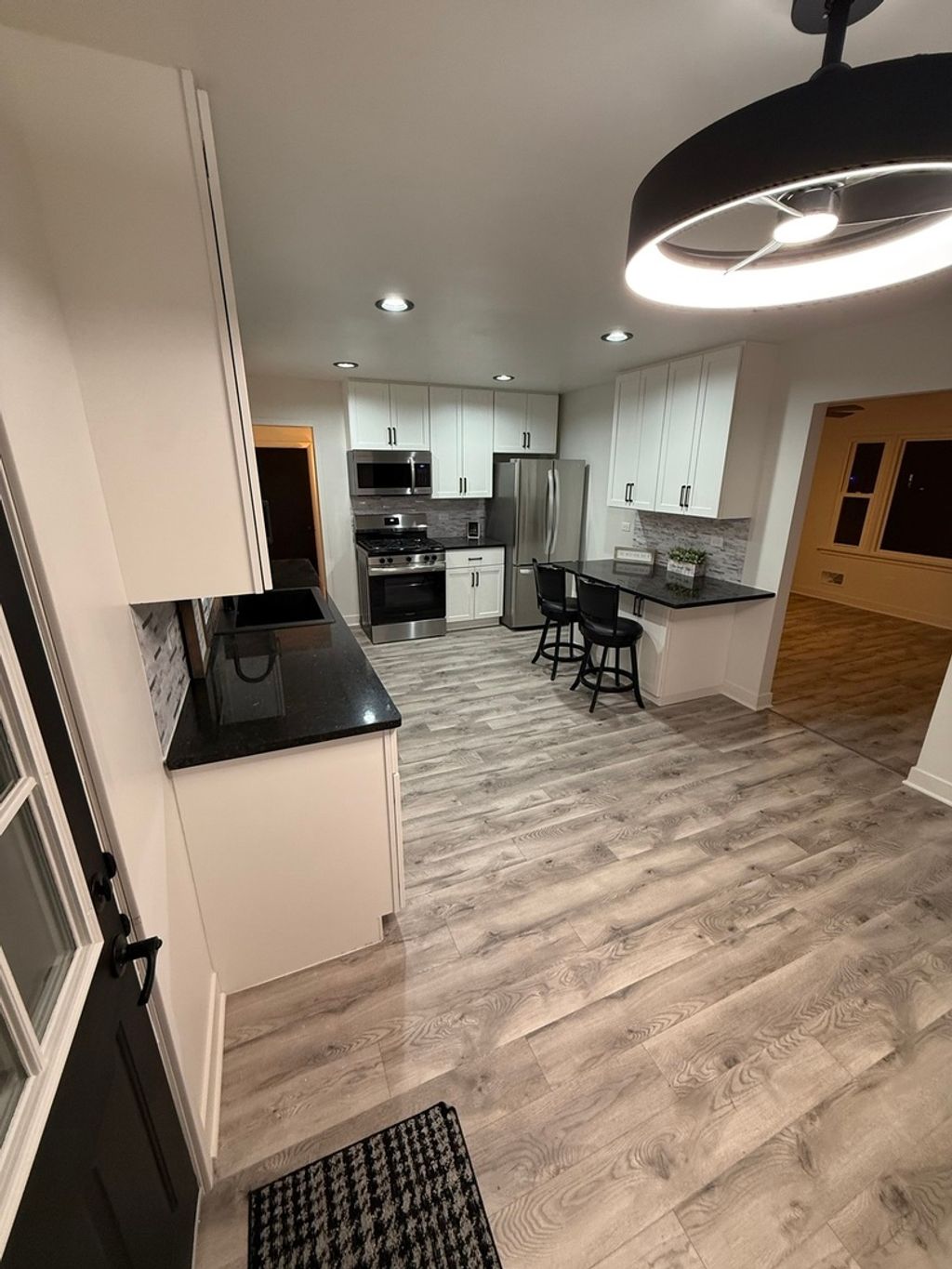 Rehabbed ranch in the Plainfield School District with low taxes! 4 bedroom with 2 full baths! New kitchen with white cabinets, quartz counters and backsplash! All stainless appliances included! Updated flooring and trim throughout the home! Upgraded light fixtures and fresh paint, this is truly move in ready! Both full baths are recently remodeled! Full finished basement with 4th bedroom and recreation room/ den/ work out room boasting new epoxy flooring! Attached garage! Back door leads to deck and nice sized back yard!