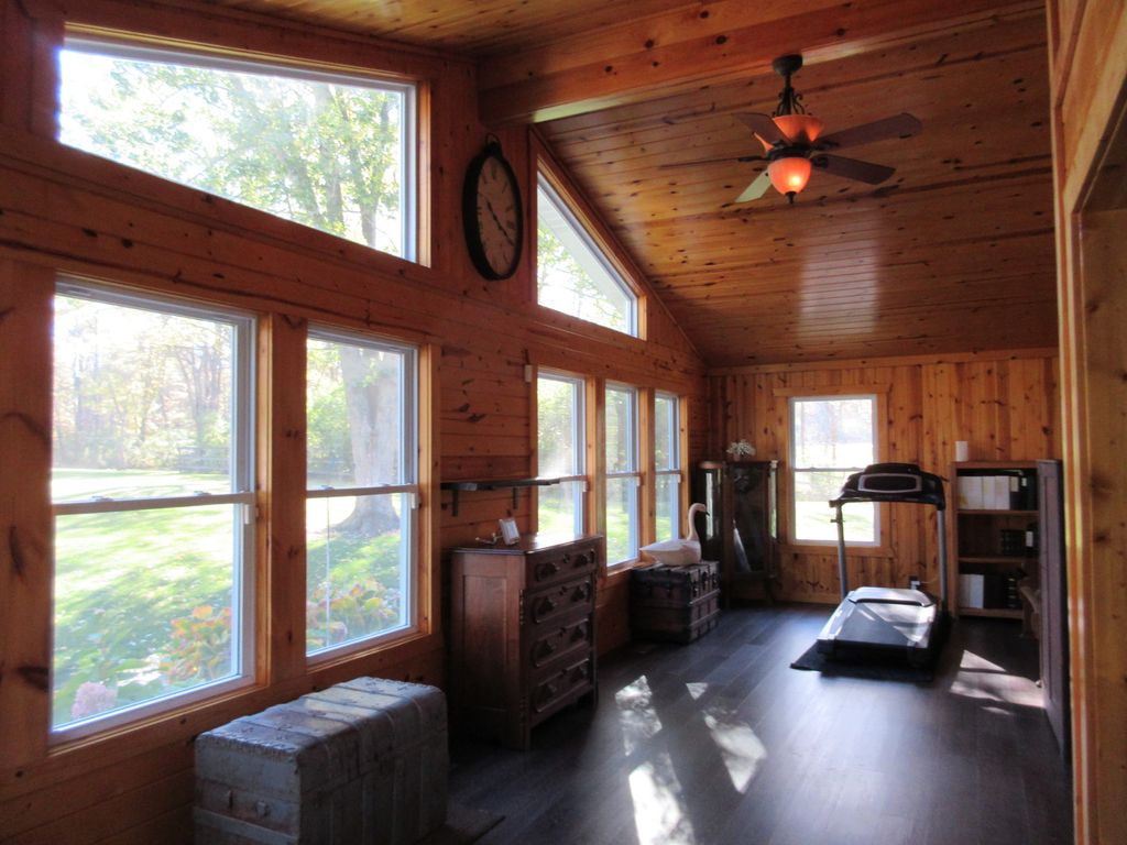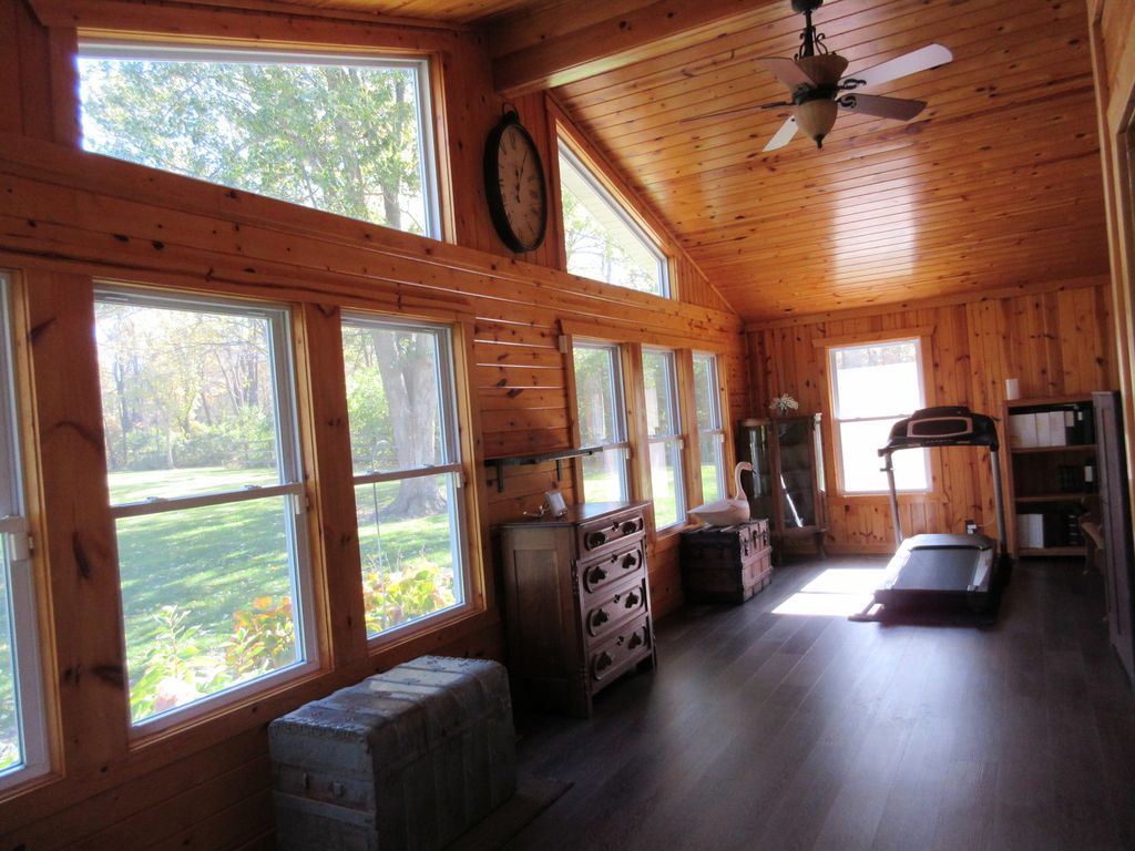 The LONG privately owned driveway leads to the serenity of this SPECTACULAR home nestled on 5.33 acres. The Pennsylvania Blue Stone walkway leads to the deck which gives access to the IMPRESSIVE Great Room featuring Pine Woodwork, Cathedral ceilings & a Trapezoid window (giving you lots of natural sunlight) to enjoy the outdoor scenery. The Kitchen features STAINLESS STEEL appliances, lovely tilework and Quartz countertops. The Living Room offers a pellet stove to add to the cozy ambience of this room. Two good sized bedrooms also have ample closet space & the Full Bath boasts beautifully updated tile/stonework & a linen closet. Expansive Basement is Perma Sealed (therefore, always remains dry) & washer, dryer & basement freezer remain. Two car detached garage & a 36' x 50' x 10' CLEARY barn/stable with 6 stalls & room for additional storage has electric & Gutter guards on the peak. Additional 31' x 30' 6" barn. HOME was COMPLETELY renovated & updated in 2012 & also has a WHOLE HOUSE GENERAC GENERATOR. This is a MUST SEE ~ it is clean, clean, clean!!