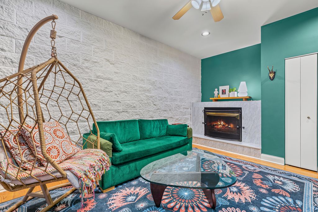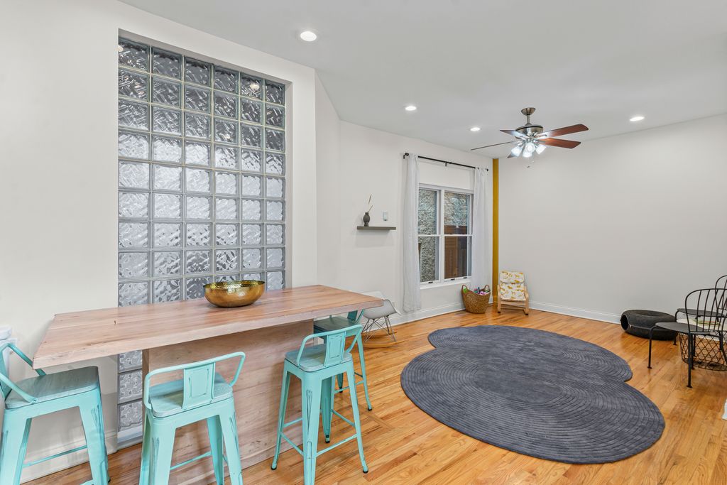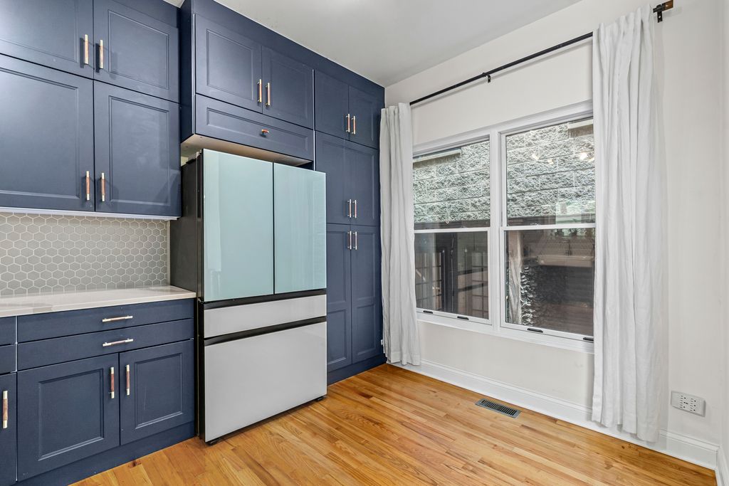 Tucked away on a very quiet Bucktown street, this spacious 3 bedroom, 2.5 bath townhome offers generous living space, thoughtful updates, private attached garage parking, a rooftop deck, and the freedom of fee-simple ownership with no HOA fees or rental restrictions. Three levels of finished living space begin with a welcoming foyer, a large family room with gas fireplace (that works), and a versatile first-floor bedroom complete with a built-in bookcase and Murphy bed-perfect for guests or a quiet home office. The open-concept second floor is designed for today's lifestyle, featuring flexible living and dining areas, a convenient half bath, and a striking NEW kitchen with rich slate-blue cabinetry accented by gold and wood hardware, a farmhouse sink, a new Bosch dishwasher, and a new Samsung Bespoke refrigerator. Upstairs, the primary suite includes a spacious walk-in closet and private en-suite bath, while a bright and airy second bedroom with easy access to another full bath provides comfort and versatility. The rooftop deck delivers sweeping skyline views and is an ideal spot for summer nights with friends, morning coffee, or simply enjoying the city from above. Oak hardwood floors run seamlessly throughout, and every closet is outfitted with custom organizers for maximum storage. A full basement provides laundry, abundant storage, and endless possibilities for customization, while private garage parking with additional storage completes the home. All this, just steps from the 606 Trail, public transit, Bucktown's celebrated restaurants, nightlife, shops, parks, and Pulaski International Elementary School. Truly a rare find. NOTES: Unit A faces Winchester, UNIT B is the middle unit accessed through the gate to the right of the A unit, Unit C faces the alley. NO HOA FEE's. Fee simple property. Recent work - new rubber roof, newly remodeled kitchen, new bookshelf and murphy bed in first floor bedroom, and more. Windows and doors 2017, High efficiency furnace 2016, AC compressor age unknown, Oven/range 2018, Microwave 2019, Bosch dishwasher 2025, Samsung Bespoke refrigerator 2025.