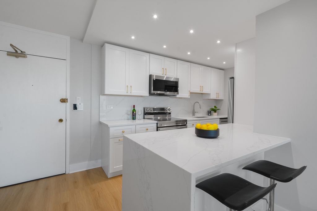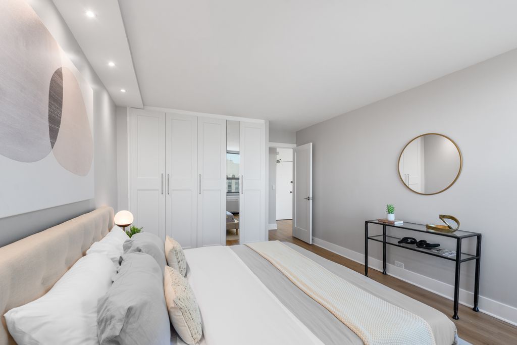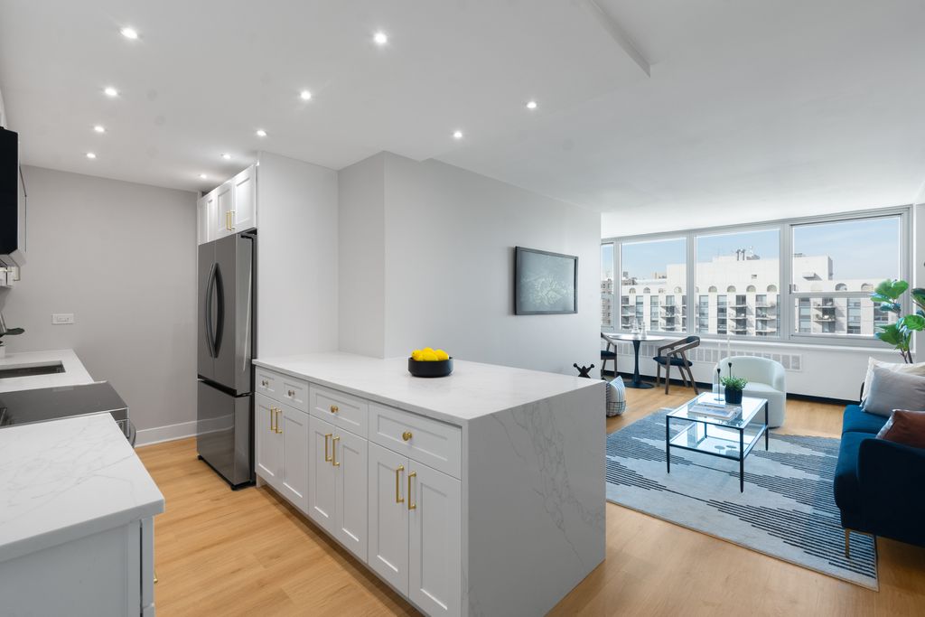 Presenting this rare new one bedroom plus Den home on a high floor (17th) with stunning views. It also has a separate dining/office space. The home has been gut rehabbed and meticulously renovated to the highest standards. Be the first to live in this redesigned floor plan for today's lifestyle and living. Top quality craftsmanship and finishes throughout. The home has all new windows. The kitchen has custom white gloss flat panel cabinets with black accent hardware, quartz counters & island with waterfall edge and breakfast bar with black/gold pendants. High-end stainless steel appliances including french door refrigerator, Kitchen opens to the living/dining room, which has new recessed lighting. The bathroom is fully rehabbed with new walk-in shower, vanity with quartz top, upscale commode & fixtures, mirrored medicine cabinet, contemporary tiles. The primary bedroom is generously sized allowing for a Den/home office,Throughout the unit there are wide plank light wood color floors. New plumbing, electrical, designer lighting and professionally organized closets throughout. Enjoy the spectacular unobstructed views from the 17th floor out over the city with amazing sunsets. Additional storage cage included in the building. Eliot House is a highly desired, well run building with low assessments & good reserves, many major updates completed including all new windows, elevators and renovated lobby. There's a newer rooftop sun deck with furniture and grill and also a ground floor patio BBQ area, renovated laundry room, 24 hour door staff, maintenance & management are onsite. Low monthly assessment includes heat, TV cable and high speed internet service (everything except electricity). Sandburg Village amenities include 2 outdoor pools & sundecks, tennis courts, hospitality rooms- (some additional fees) The landscaped courtyards, play lot, commercial facilities provide a welcoming community environment. Convenient for transportation - train/subway on same block, buses at door, access to Lake Shore Dr, bike path. Located in Gold Coast / Old Town, close to downtown, Lincoln Park. Enjoy all attractions of the neighborhood - restaurants, nightlife, shopping, new Jewel, Lakefront trail, beach, parks. Pool and FFC gym are next door. Pets allowed. Parking in building garage only $150 p/m there is a wait list.