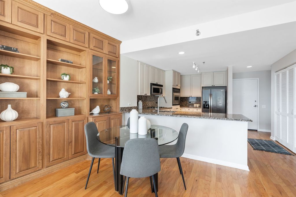 Bright and spacious two bedroom, two bathroom unit in the full amenity Prairie House at Central Station. The open concept layout offers excellent east facing views of Lake Michigan, Solider Field, Museum Campus, and the city skyline. The living and dining area feature hardwood floors throughout and an inviting gas fireplace surrounded by beautiful custom built ins. The space is filled with natural light from the large windows and slider doors to the private balcony with more stunning east facing views. The updated kitchen has a large eat-in peninsula with granite countertops, plenty of cabinet storage, and all stainless-steel appliances. The spacious primary suite features new hardwood floors, more east facing views, walk-in-closet with custom organizers, a second closet that could function as an office space, and ensuite primary bathroom with dual sink vanity, glass enclosed shower, and separate soaking tub. The second bedroom is also spacious with custom built-ins and ample closet space. The second bathroom with new quartz countertops. Freshly painted throughout, laundry closet with side-by-side washer and dryer, and additional storage cage included. One garage parking space available for additional 25K. Monthly assessment includes heat, A/C, gas, water, trash, sewer as well as comcast cable with HBO and high-speed internet. Building amenities include 24-hour door staff, sundeck, party room, and a fitness center. Excellent South Loop location near the lakefront trail, Soldier Field, Museum Campus, and many wonderful shops and restaurants.