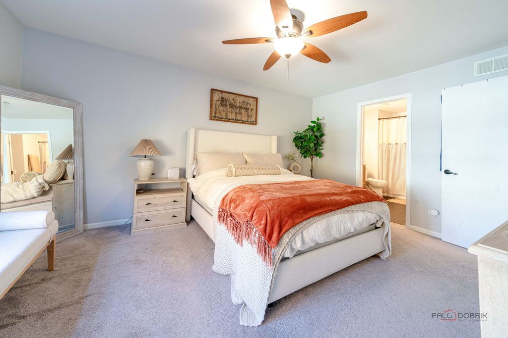 Move-In Ready Townhome with Finished Basement & Water Rights to Wooster Lake! Maintenance-free living awaits in this beautifully updated townhome offering water rights to Wooster Lake. The bright and spacious eat-in kitchen features abundant cabinetry, updated stainless steel appliances (2021), and a slider leading to a private deck with courtyard and partial lake views. The inviting living room offers a fireplace, vaulted ceilings and laminate flooring (2022), and skylights that fill the home with natural light. The large loft provides excellent flexibility for an office, family room, or potential third bedroom. The primary suite includes a walk-in closet with custom built-in shelving (2021), ceiling fan, and a newly remodeled primary bathroom (July 2025). Additional features and updates include: * Carpet installed (2021) * New door handles and hinges (2021) * Freshly painted interior (2022) * New light fixtures (2022) * Laminate flooring and trim throughout first floor (2022) * Finished basement with half bath (2023) * New washer and dryer (2024) * New toilets throughout (2024) * Most mechanicals 6 years old or newer Full lookout finished basement with half bath. Second-floor laundry. Two-car attached garage. Tanneron Bay is a desirable, well-managed community featuring wooded walking paths, park and lake rights to beautiful Wooster Lake, where residents can fish, canoe, kayak, sail, or boat. Conveniently located close to shopping, restaurants, schools, Metra, and Rt. 59. This home combines thoughtful updates, comfort, and a peaceful setting - a must-see!