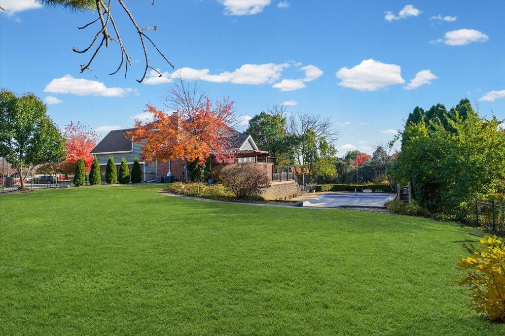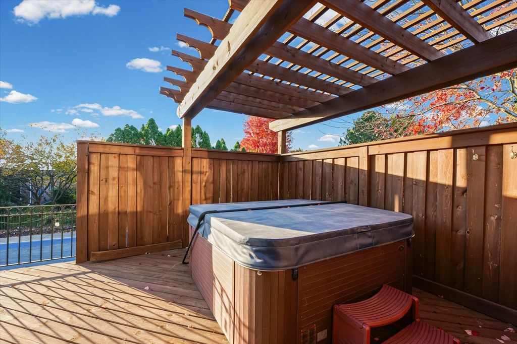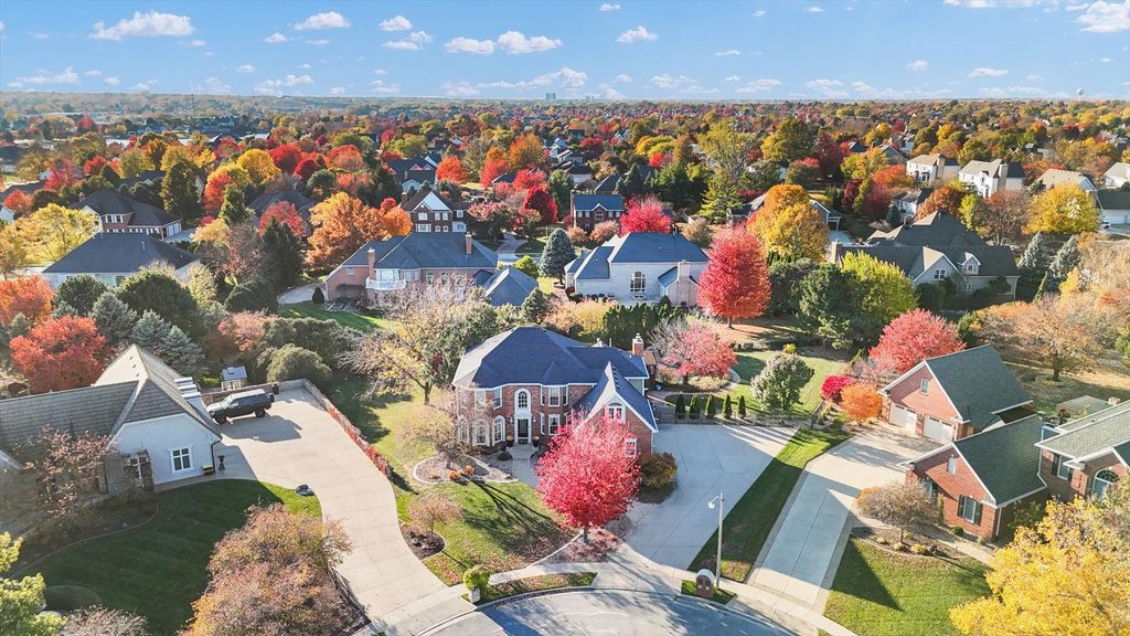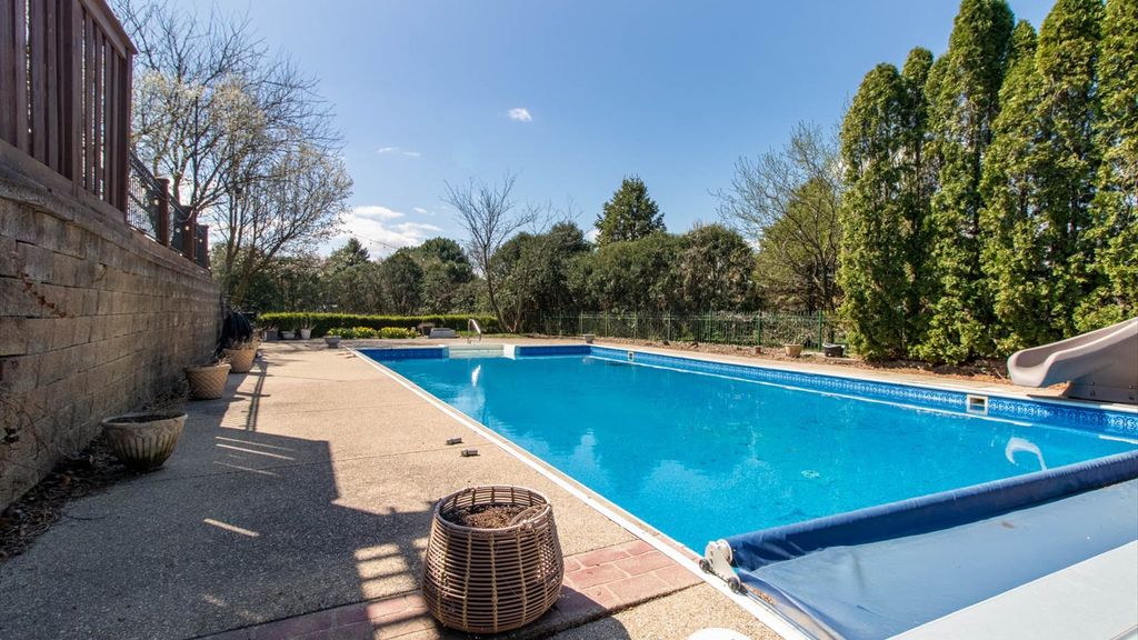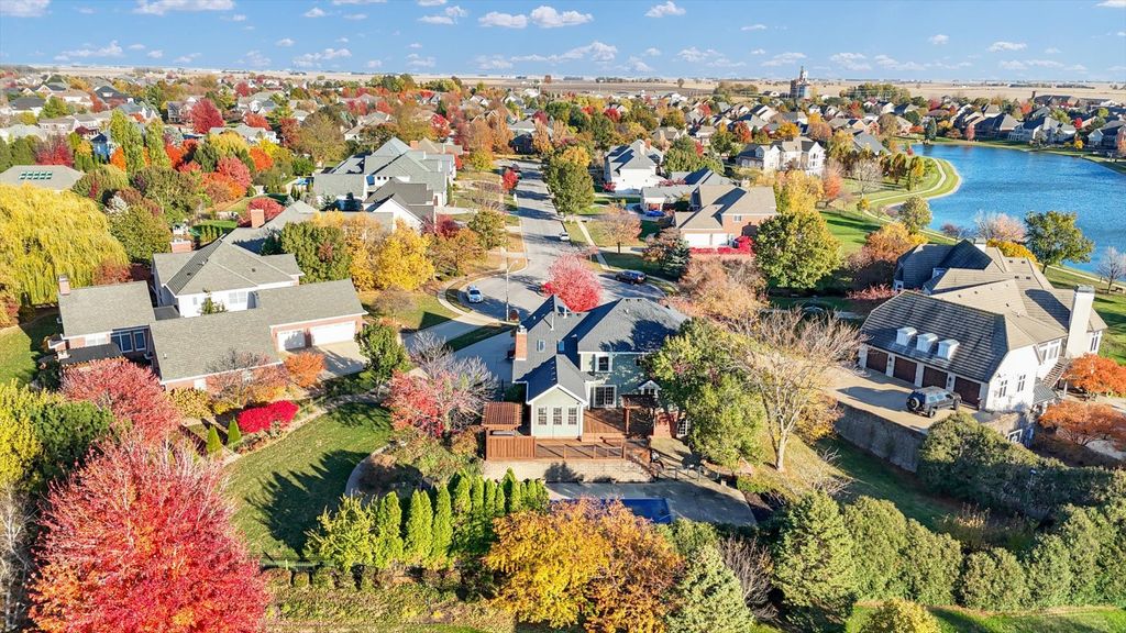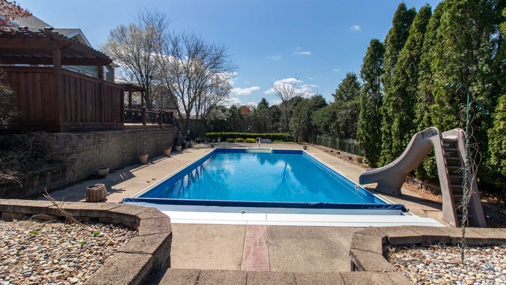 Welcome to 1 Windsong Way! An elegant, one-of-a-kind 5-bedroom, 4.5-bath walk-out Tudor perfectly situated on a peaceful cul-de-sac with private lake access. Resting on a half-acre lot with professional landscaping with an abundance of outdoor living space, this home offers resort-style living with a 24' x 48' in-ground pool, private hot tub area, and an expansive wraparound deck-ideal for entertaining and relaxation. Step inside to discover 9-foot ceilings, a formal dining room and living room, and a spacious eat-in kitchen featuring a large center island with seating, quartz countertops, a wet bar, and updated dishwasher and microwave (2024). The family room impresses with a vaulted ceiling, custom built-ins, and a cozy fireplace-perfect for winter nights. A sunlit four-seasons room with outdoor access provides a warm, inviting space year-round. The private office with custom-built-ins, conveniently located off the kitchen, offers a quiet space for work or study. Upstairs, the primary suite is a true retreat with its own fireplace, tray ceiling, and a spacious walk-in closet with built-ins, wall safe, and additional storage. The upper level also includes an en-suite bedroom and Jack-and-Jill bedrooms, all with new carpet (July 2025). The walk-out basement expands your living space with generous recreation areas and two large storage rooms with built-in shelving. New flooring was added in 2021. Additional features include first-floor laundry with custom cabinetry and shelving, three-car side-load garage with ample guest parking, new roof and pool heater (2023), new HVAC systems (2022), new water heater (2021), and irrigation system. This elegant and meticulously maintained home combines timeless Tudor charm with modern amenities, all in a premier location. Don't miss the chance to make this exceptional property your next home!