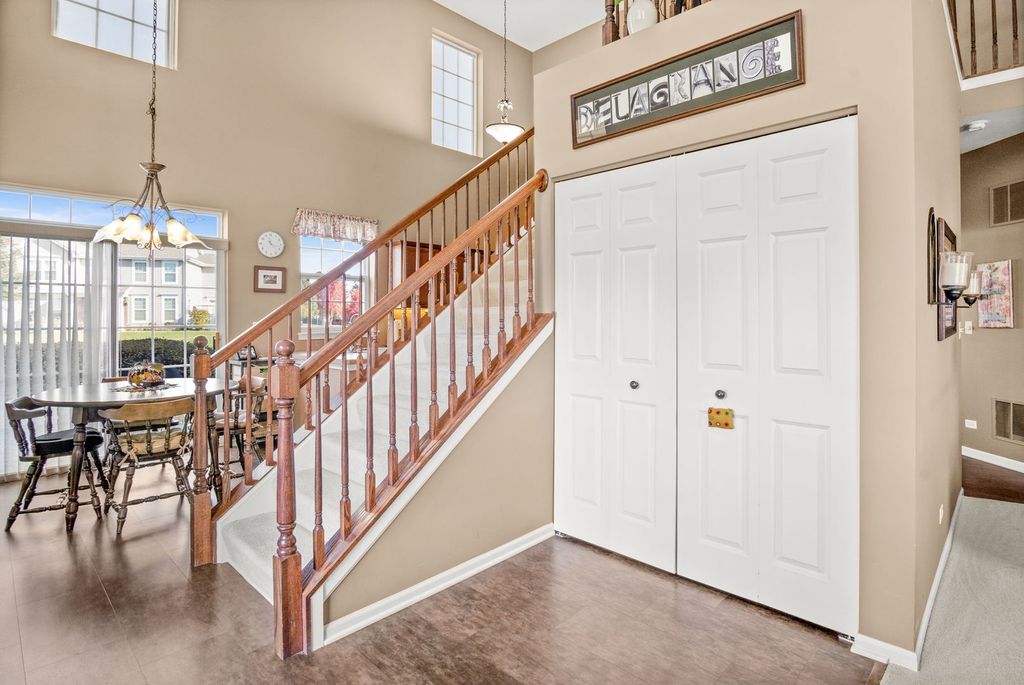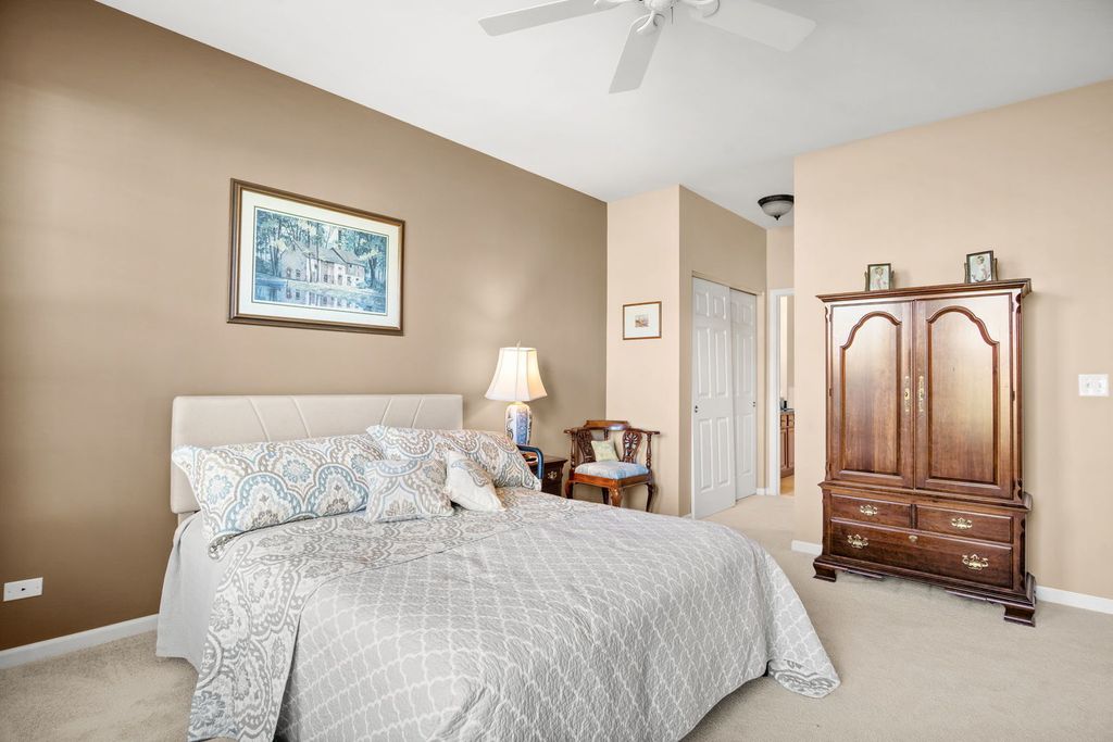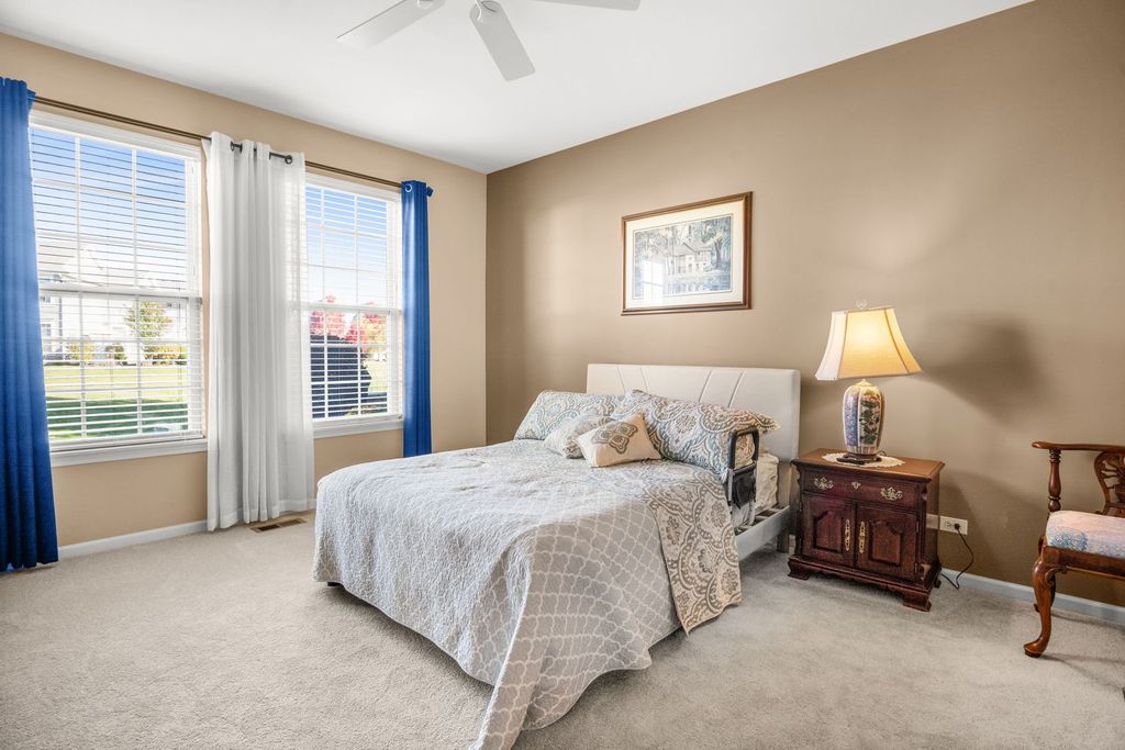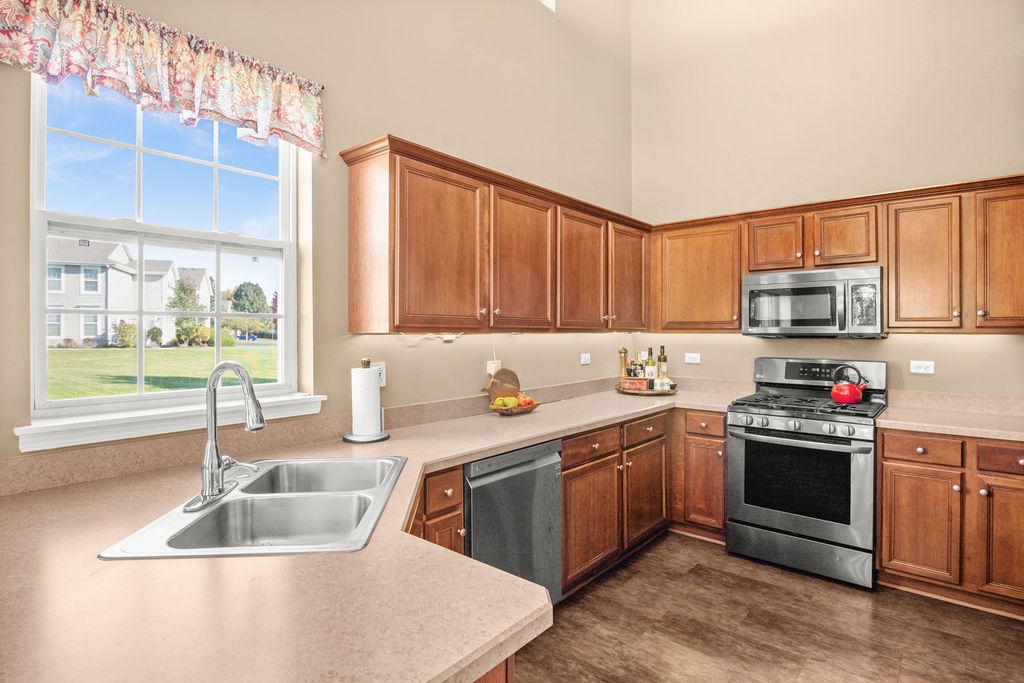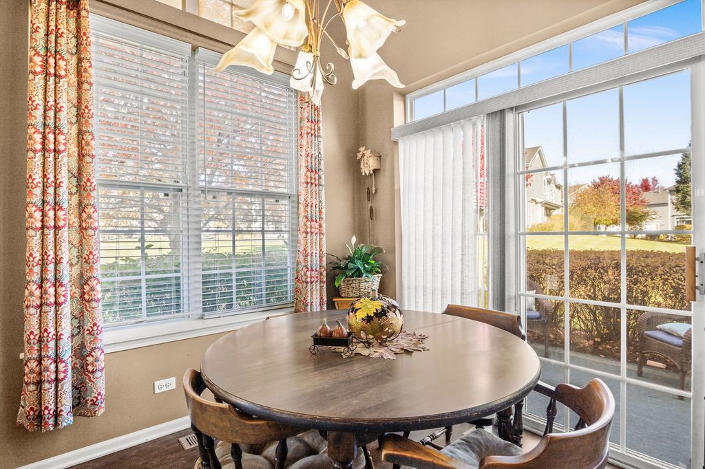 Set on a landscaped lot in Sugar Grove's sought-after Windsor Pointe neighborhood, this beautifully maintained end-unit townhome offers comfort and convenience in a modern, light-filled design. The 2-bedroom, 2.5-bath layout includes an inviting front porch, a private backyard patio, and a 2-car attached garage. Inside, vaulted and two-story ceilings create an airy feel throughout the open-concept living areas. The living room features a corner gas-log fireplace and abundant natural light, while the eat-in kitchen showcases stainless steel appliances, under-cabinet lighting, and a bright breakfast room with slider access to the patio. The main-floor primary suite includes a private bath with double bowl vanity, soaking tub, and separate shower, along with a convenient first-floor laundry and powder room. Upstairs, a spacious loft overlooks the living room and leads to a second bedroom and full bath-perfect for guests or a home office setup. Updates include newer HVAC and water heater, and the HOA covers exterior maintenance, lawn care, and snow removal for effortless living. Located in the acclaimed Kaneland school district, this home offers easy access to local parks, shopping, and I-88. Garage refrigerator included.