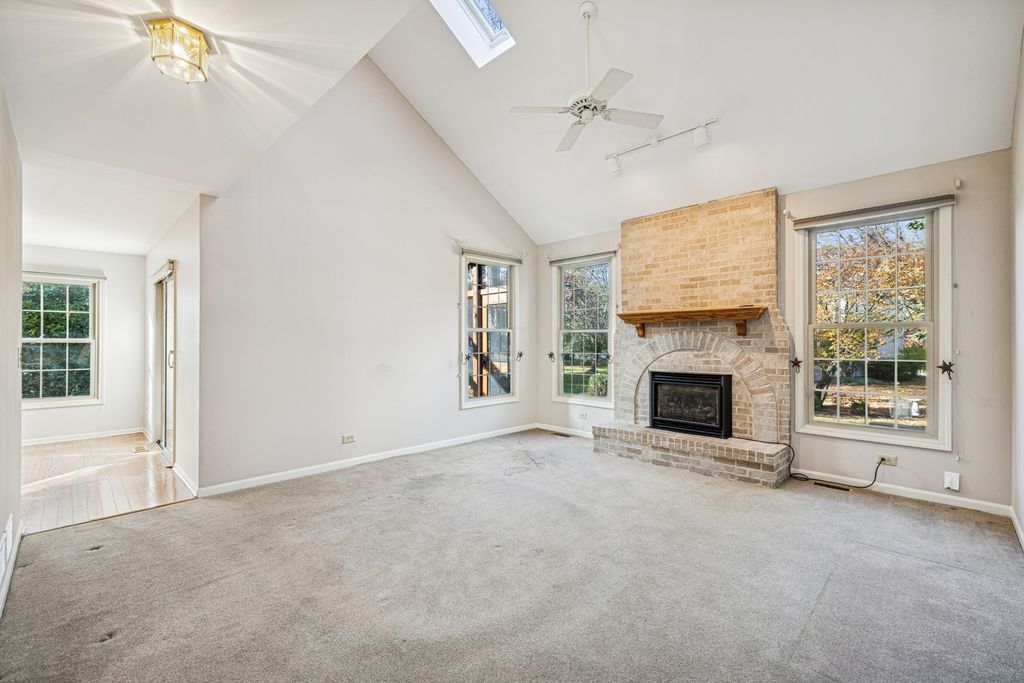 Charming home in an incredible location in desirable Woodscreek neighborhood!!! Well loved and maintained by long-time owners, this Greenhill model is the only one in Woodscreek that features the primary bedroom on the first level. Freshly painted with newer, upgraded windows throughout! The first floor suite is quite spacious, with TWO W/I closets, so no need to share, lol! Family Rm has lovely fireplace and two skylights in the cathedral ceiling that quite create just a lovely space w/great views of the beautiful backyard. Dining Rm has custom build-ins and flows into the spacious kitchen featuring a generous center island with abundant storage, plus plenty of cabinetry to keep everything organized. Gorgeous sunroom ideal for relaxing, entertaining, or simply soaking in the surrounding views! Upstairs, you will find 3 spacious bedrooms, each filled with natural light from large windows; including one with serene views of Woodscreek Park. A charming catwalk overlooks the family room below, adding an open, airy feel. Generous closets and additional storage ensure plenty of space for everything you need. Beautifully landscaped back yard offers a private retreat with mature plantings and lush greenery, while still enjoying a picturesque view of Woodscreek Park.