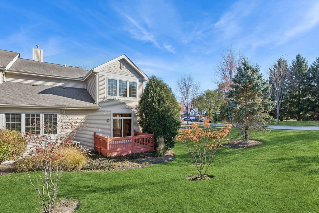 This charming town home offers a lifestyle of ease and comfort, catering perfectly to those seeking low-maintenance living without compromising on space or amenities. Discover the convenience of single-level living, when necessary, with a highly desirable, large first-floor primary suite. This sanctuary boasts a two-story vaulted ceiling and an ensuite bathroom featuring a dual sink vanity, garden tub, and walk-in shower. The main floor showcases gorgeous hardwood flooring throughout the main living and dining areas. The dramatic two-story living room is bright and airy, connecting seamlessly to a versatile overhead loft sitting area. Upstairs, two additional bedrooms provide ample room for guests, hobbies, or a home office. A fabulous bonus room offers endless possibilities - for exercise, a creative space, or as an extra storage area - truly adaptable to your evolving needs. A full, clean, and dry unfinished basement provides abundant storage for seasonal items. Or it awaits your design skills to to make it something unique and versatile for your family! Step outside onto the nice-sized deck off the living room. It overlooks a common green area and is naturally screened by trees for privacy -- an ideal spot for quiet relaxation or casual outdoor dining. Chelsey Crossing is a prime Gurnee location. Enjoy quick access to every necessity: abundant shopping, medical offices, grocery stores, the library, and local parks. The neighborhood features a walking path, and there are plenty of forest preserve spaces nearby for nature lovers. Commuting is a breeze with easy tollway access and Libertyville or Wisconsin are just 10 minutes away. This home is a perfect 10!