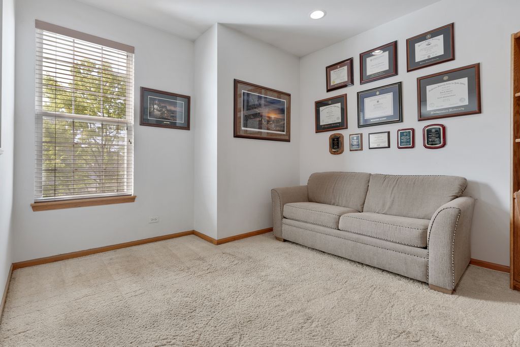 Luxury upper level rarely available 3 bedroom plus den 2 bath largest model in exclusive Lions Gate. Huge great room with sliding glass door to balcony. Stainless steel appliances, vaulted ceilings, spacious living room. Large kitchen with pantry & breakfast area. Upgrades include new washer, dryer, AC, Furnace. Primary bedroom features built up walk in closet. Attached main bath with w/shower and separate soaked tub plus double sinks. Oversized 2 car garage. Located just minutes from Woodfield shopping, Golf course, I-90/I-290/355 Expressways. Excellent combination of schools with Michael Collins, Margaret Mead and Conant High. Investor friendly.