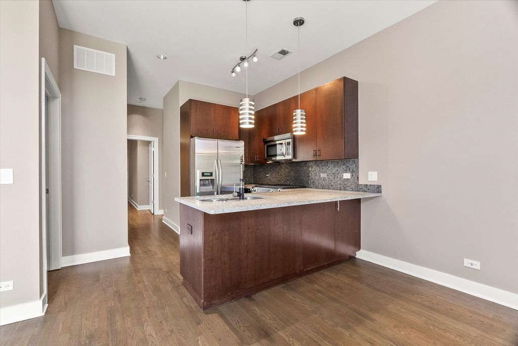 Located in a boutique 16-unit corner building at Madison & May in the heart of the West Loop, this sun-filled south-facing condo blends modern luxury finishes with unbeatable location. Every home in the building is a corner unit, and this residence stands out with solid hardwood floors throughout - refinished in 2024, and soaring 10' ceilings. The open-concept kitchen is a chef's dream with granite countertops, KitchenAid stainless steel appliances, Bosch dishwasher, and solid wood cabinetry. The expansive living and dining area flows seamlessly for both everyday living and entertaining. The spacious 15'x12' primary suite includes a walk-in closet and a spa-style bath featuring a double vanity, heated tile floors, separate shower and soaking tub, plus jacuzzi for the ultimate retreat. Enjoy morning coffee or evening sunsets from your private balcony with stunning views of the downtown skyline and Madison Street energy below. Enjoy the lifestyle only Madison Street can offer. Right outside your door are some of Chicago's best restaurants, retail shops, and nightlife. The building also features a large shared rooftop deck with sweeping city views, heated garage parking included, and Google Fiber internet included. Low monthly HOA. All this just steps from Skinner Park, Fulton Market, and Restaurant Row, this residence offers the perfect blend of comfort, convenience, and West Loop energy.