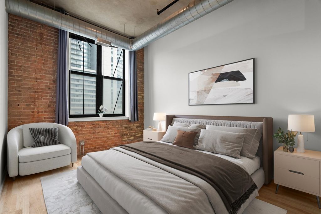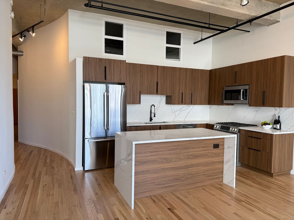 Perfectly positioned at Washington & Green St, just one block south of Randolph's Restaurant Row and Fulton Market. This condo, fully renovated in 2025, offers the ultimate West Loop lifestyle. Surrounded by Chicago's top dining, retail, and nightlife destinations, the home combines historic loft character with today's modern luxury. Inside, soaring 12-foot ceilings, exposed brick and ductwork, and newly refinished solid hardwood floors, frame oversized east-facing windows with skyline views and abundant natural light. The brand-new chef's kitchen is a centerpiece, featuring high-end Bosch appliances, waterfall-edge quartz countertops and backsplash, a deep workstation sink with premium accessories, and custom cabinetry. The thoughtful split-bedroom layout includes a private east-facing balcony overlooking downtown, perfect for morning coffee or evening wine. Both bathrooms were fully renovated in 2025 with spa-inspired finishes, contemporary tilework, designer vanities, and premium fixtures. Freshly painted walls throughout make this a true move-in-ready home-nothing left to do. Deeded gated parking is available in this boutique elevator building. Just steps from Parlor Pizza, Sawada Coffee, Nobu, Soho House, Whole Foods, and the very best of West Loop living. This home is a rare opportunity in one of Chicago's most sought-after neighborhoods.