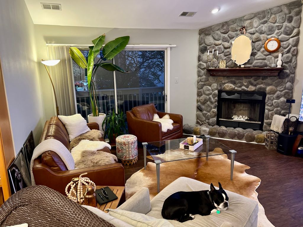 Bright and spacious 3-bed 2-bath 2nd floor end unit. Open concept living/dining area with vaulted ceilings and cozy wood-burning fireplace. Updated kitchen features quartz countertops, new stainless-steel appliances and eat in area. Large master bedroom with bay window, walk in closet and en-suite bath. Laundry room with new washer and dryer. Walk in coat/shoe closet. Attached 1 car garage with additional parking spaces. Conviniently located close to shopping, dinning, walking/biking paths and major transportation.