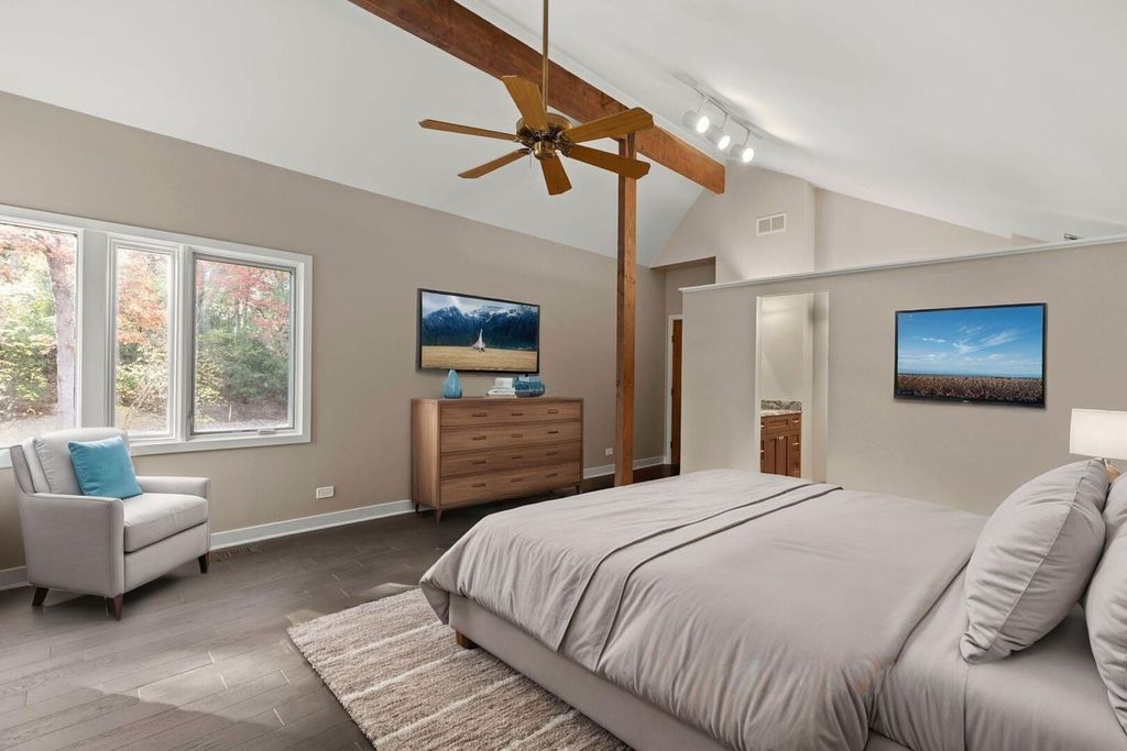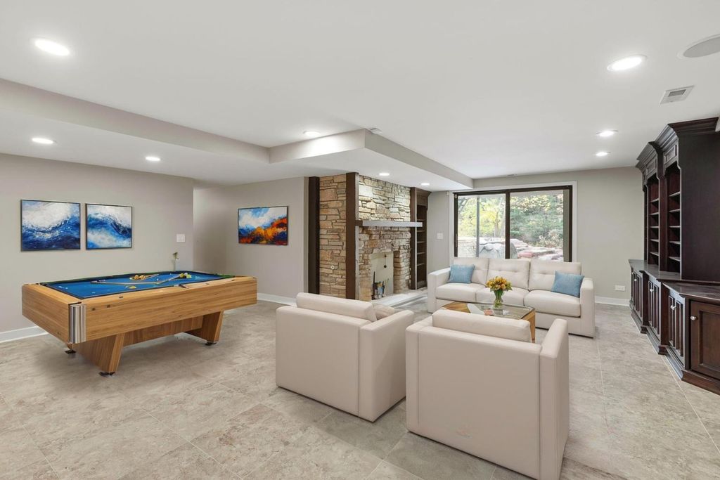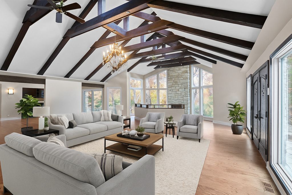 Sharp lines and appointed angles, fuse art with functionality from indoor to outdoor spaces creating a harmonious connection among 5.33 acres of pure serenity. Design elements, dramatic entrances and expansive windows invite the outside in while redefining opulence. French doors unveil expansive vaulted ceilings with exposed beams carried throughout the family room and recessed lounge area. This brilliant space is filled with soaring windows complimenting a gorgeous stone fireplace. The opposing side of the family is an exemplary space for entertaining running contiguous with the rest of the main level while featuring an additional area to congregate with a wet bar and multiple sliders outlining the front of the home leading to the wrap around porch. The main floor also showcases a powder room, separate mud/laundry, and a guest suite with double vanities and shower. Aligned to the back of the home is an elegant dining room with an intimate fireplace, balcony overlooking the indoor pool and sliding door access to the yard. Down the hall from the dining room on its own wing is the primary suite with vaulted ceilings, separate siting room, fireplace, sliders to a private patio, sprawling closet accommodating any size wardrobe and 2 access points to a spa like primary bath with an oversized independent soaking tub, phenomenal shower with rain features and double vanities. 2 additional levels offer separate living quarters with a loft and guest suite on one and the offering full bathroom and laundry room down the hall from the bedroom. The 4th bedroom is a sweeping space above of the garage with a Romeo and Joliet balcony. Ground level to the yard is a stunning kitchen with natural hickory cabinets, granite counters, new Wolf range, new Sub Zero Fridge, separate breakfast bar area and access to 3- seasons room. Finished walkout lower level with an additional fireplace, full bathroom with single vanity and shower. The walkout lower level also offers a separate lap pool and hot tub room overlooking the meticulous landscaped grounds. 4-car attached garage! Incredible outdoor space with multiple patios consisting of a bluestone patio, pavers that surround the outdoor fireplace, hardscape, stones that fill the yard making for a much more maintenance free property and beautiful trails throughout. Located within the top-rated Barrington 220 school district and close to horse-riding trails, this property perfectly combines luxury, privacy, and convenience. New in the last year is the majority of windows, fixtures, appliances, electric, plumbing, exterior stonework, new wet bar and DaVinci roof.