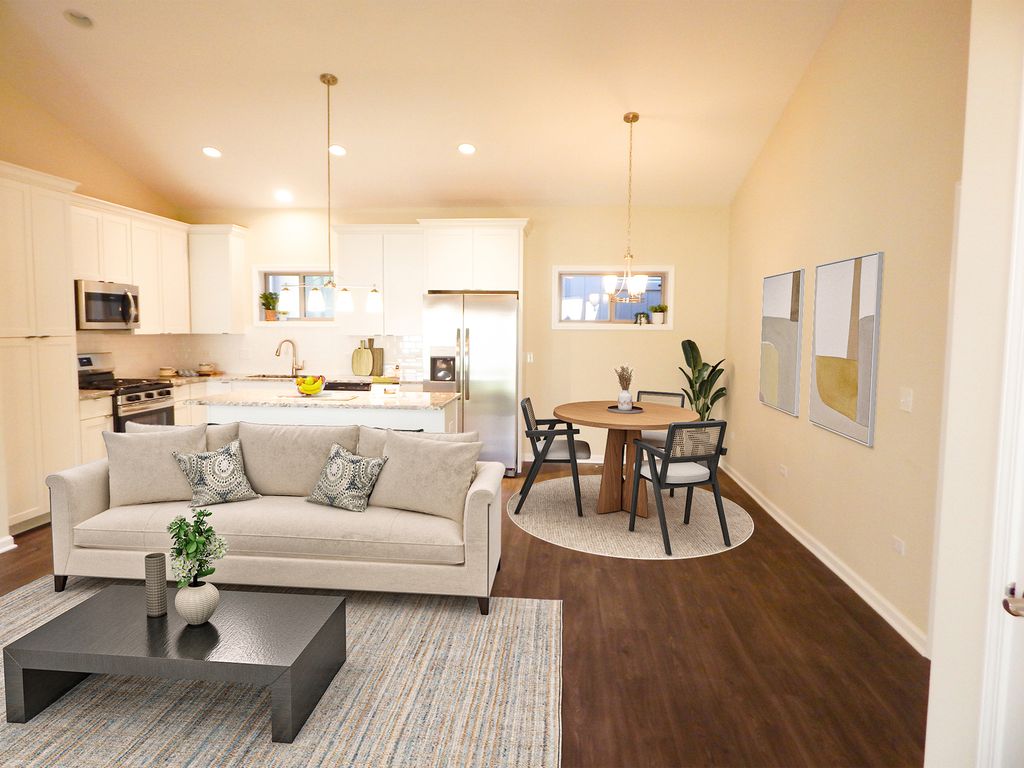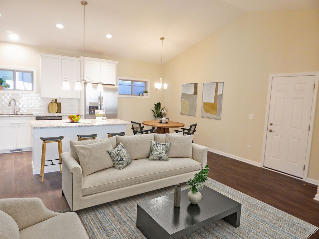 Beautiful quality built new construction home, Move in Ready! 3 bedroom, 3 full baths, the 3rd bedroom is currently used as an office, finished walkout lower level and featuring a large 2 car garage, vaulted ceilings, beautiful primary with open morning sunrise exposure! stainless steel appliance package, solid surface countertops with island and dining area open to the great room on the first floor. Low monthly HOA includes snow removal, lawncare, water/sewer, scavanger & common ins.Ready to move right in now. Beautiful build out with many quality features!