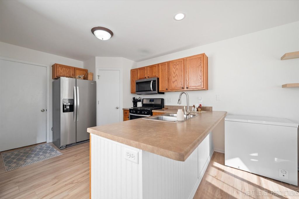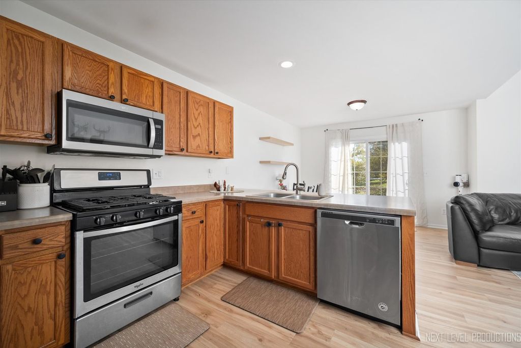 Stunning and fully updated Wineberry townhome-move-in ready and beautifully maintained! Convenient location near downtown DeKalb, Northern Illinois University, and downtown Sycamore. The home offers a private covered entrance leading to a bright two-story foyer and an open-concept main level, ideal for entertaining or everyday living. The living room features a soaring ceiling and dramatic two-story wall of windows, providing abundant natural light. The updated kitchen includes a full Whirlpool stainless-steel appliance suite (5-burner gas range), ample cabinetry, walk-in pantry, and peninsula island with breakfast bar seating for three. The adjoining dining area overlooks the private backyard. Upstairs, both bedrooms are spacious. The master suite offers a vaulted ceiling, shared bath with tub/shower, and a 10'x6' walk-in closet. The finished basement adds valuable living space with a family room, bar area, full bath with walk-in shower, storage, and a proper egress window--allowing for a possible third bedroom. Recent updates: Roof (2022), Flooring (2022), Furnace - induction motor & heat exchanger (2021), Water heater (2021), Driveway (2018). Perfect for first-time buyers, families, or investors seeking rental potential. Schedule your showing today!